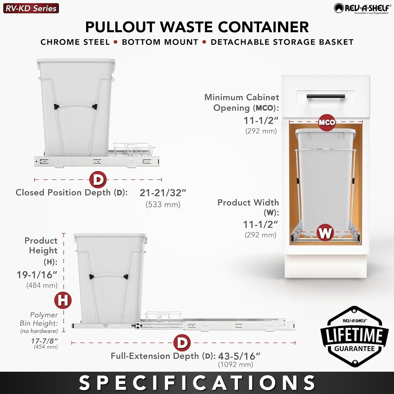 - Smooth Gliding Garbage Can: Built with a chrome-plated heavy-gauge wire construction frame that effortlessly slides in and out on full-extension, ball-bearing, rear basket for extra storage, lids are available and sold separately