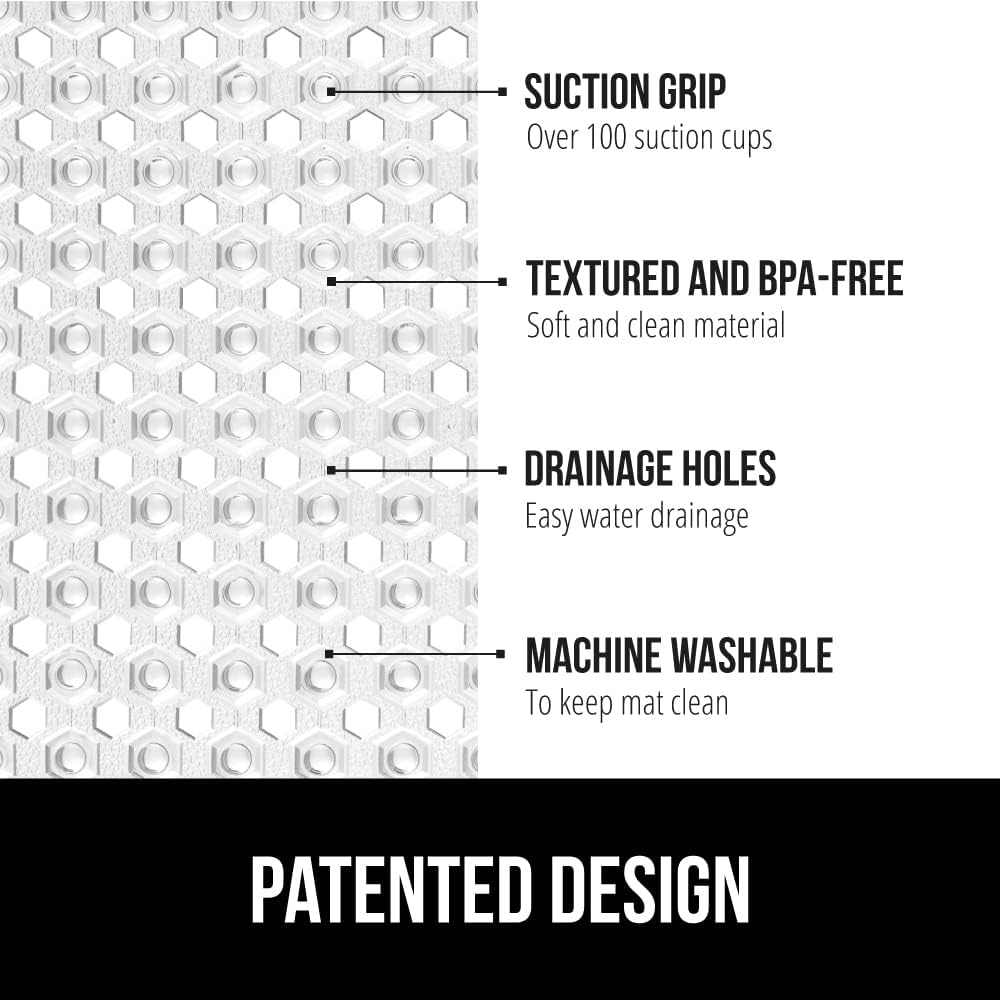 - PATENTED DESIGN WITH POWERFUL SUCTION GRIP: a shower mat designed to securely stay in place; the patented mat features hundreds of suction cups that effectively help secure the mat to your tub or shower floor