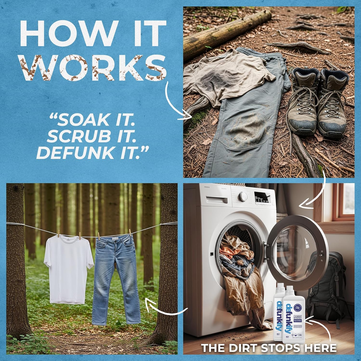 - šŖš®ššµ ššµš² ššš»šø š¢šš!' ššš®šæš®š»šš²š²: Defunkify's laundy detergent enzymes clean deep within fabric fibers to eliminate the residue, oils, sweat & heavy cover-up scents left behind by other washing detergents. As a scent free 'Free & Clear' laundry detergent w/ all natural old odor eliminator & set-in stain remover ingredients, šš¼ššæ š°š¹š¼ššµš¶š»š“ šš¶š¹š¹ šÆš² š¹š¼š¼šøš¶š»š“ & š³š²š²š¹š¶š»š“ š¹š¶šøš² š»š²š š¶š» š® šš¶š»š“š¹š² šš®ššµ, š“šš®šæš®š»šš²š²š±.