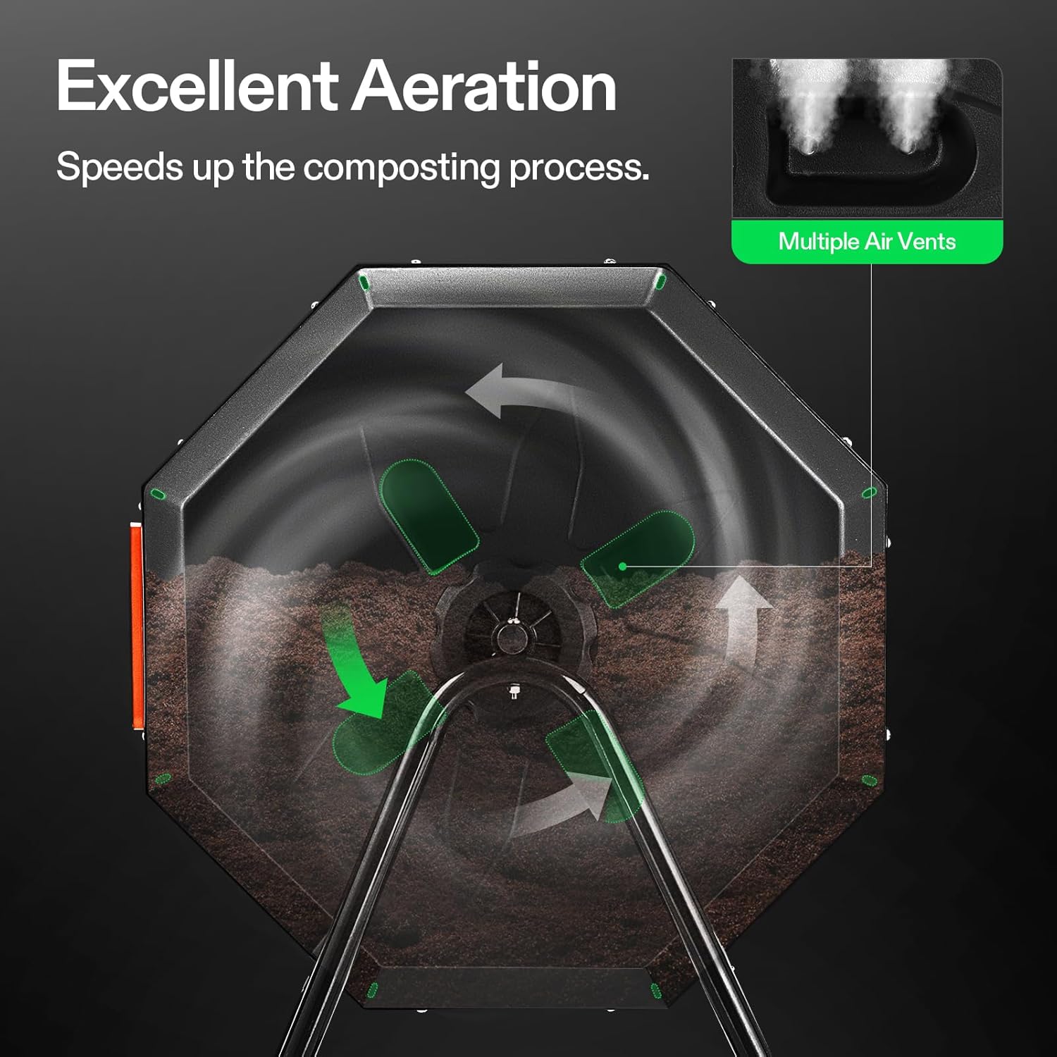 - Twin chambers: Two separate chambers allow one side to finish composting while leaving the other side available to add fresh wastes; Constant alternation of the two sides will create an uninterrupted stream of nutritious compost