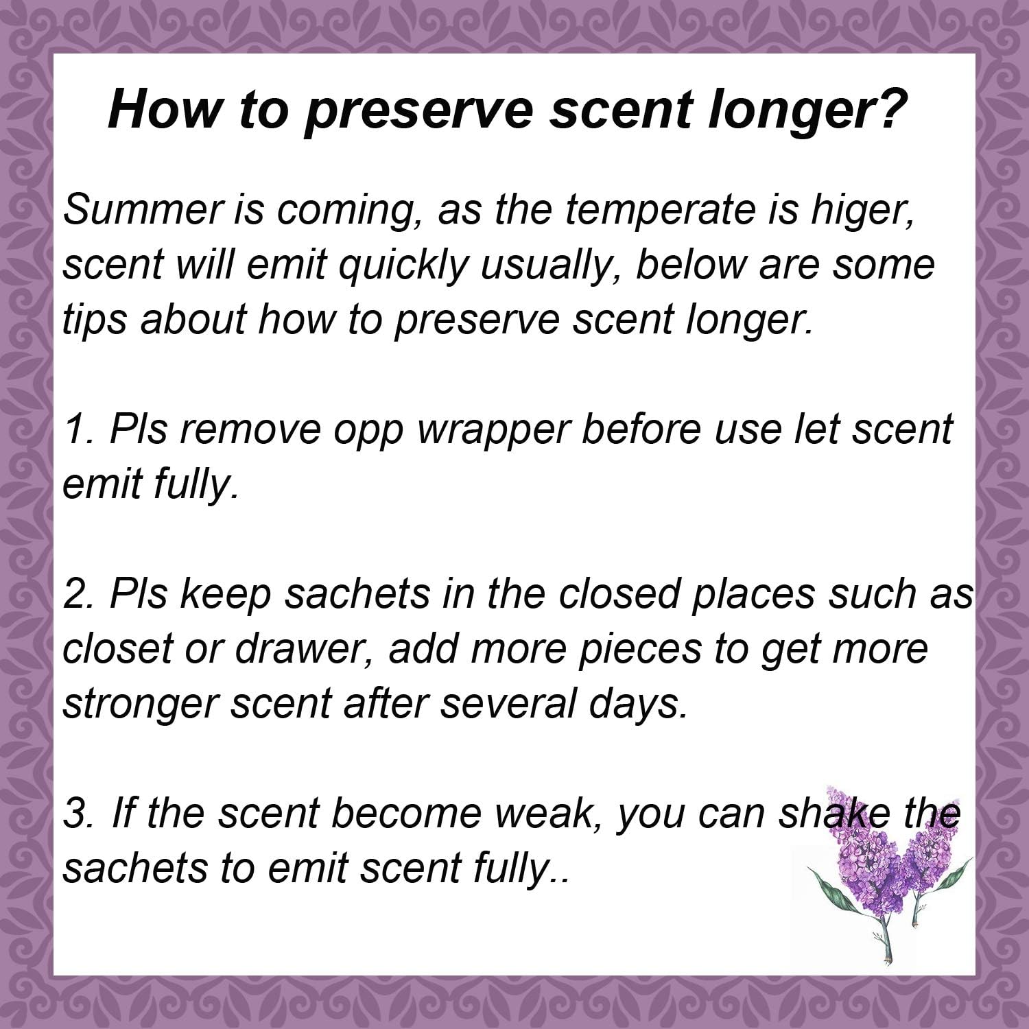 - Enjoy Life with Sweet Aroma: It is better to put our scented sachet packets in closet places in order to preserve scent longer. So just place these closet sachets to closet, drawer, cars, suitcase and handbags to let your life be filled with perfect sweet fragrance, always keep a good mood.sachet bags scented can be used for aroma therapy to nourish and stimulate the body and soul, let you feel calming and relaxing.