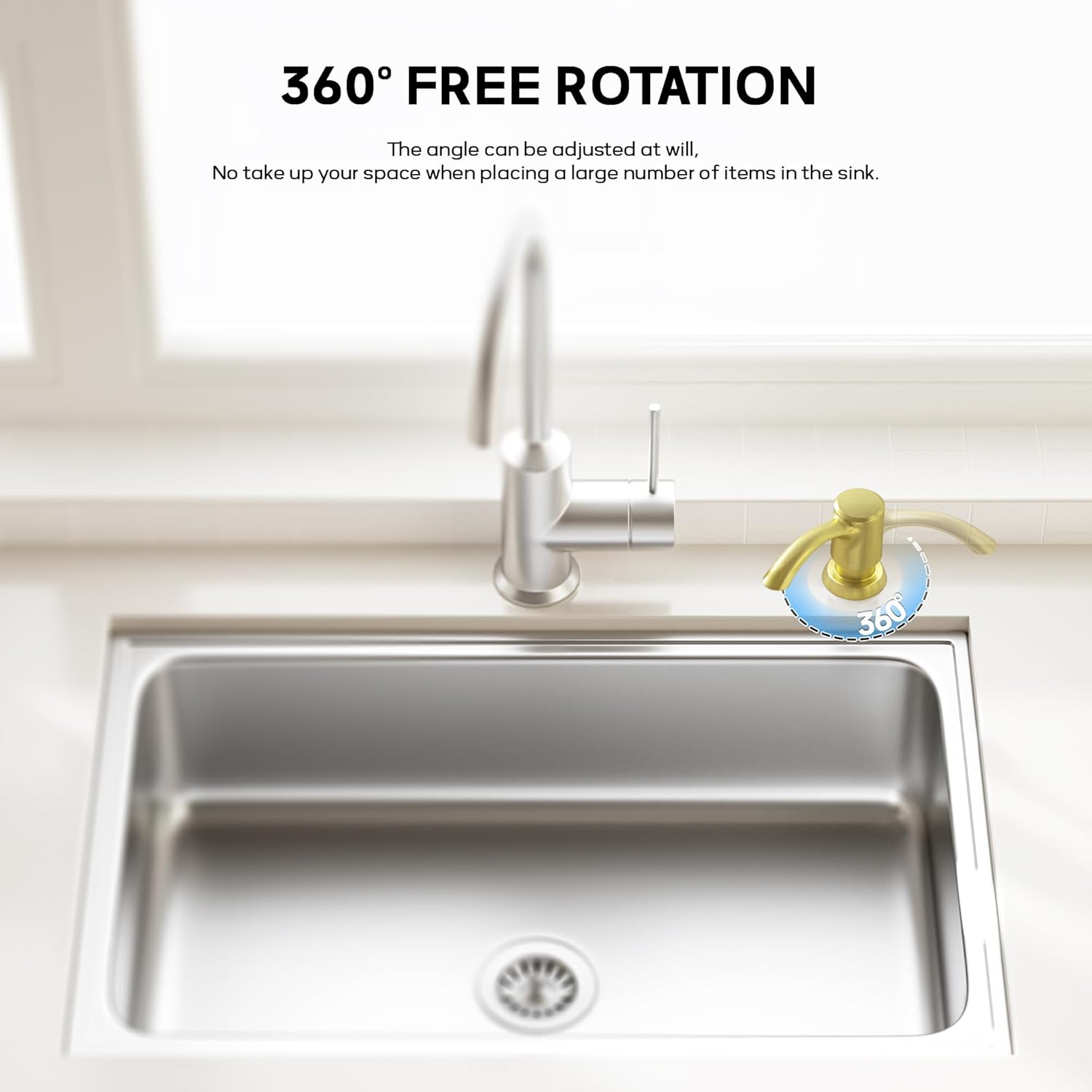- 【Versatile Design】- Our soap dispenser is designed to work with a variety of liquid products, such as hand soap, lotion, and detergent. The 360-degree swivel feature allows for use from any angle, maximizing counter space efficiency.
