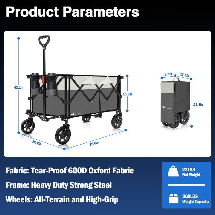- Compact Storage: Fully open, the foldable wagon measures 42.1" x 36.6" x 22.4"; when folded, it’s just 24.4" x 14.4" x 9", saving over 80% of space. Lightweight at 22 lbs with two convenient cup holders, this wagon cart fits easily in the trunk or at home