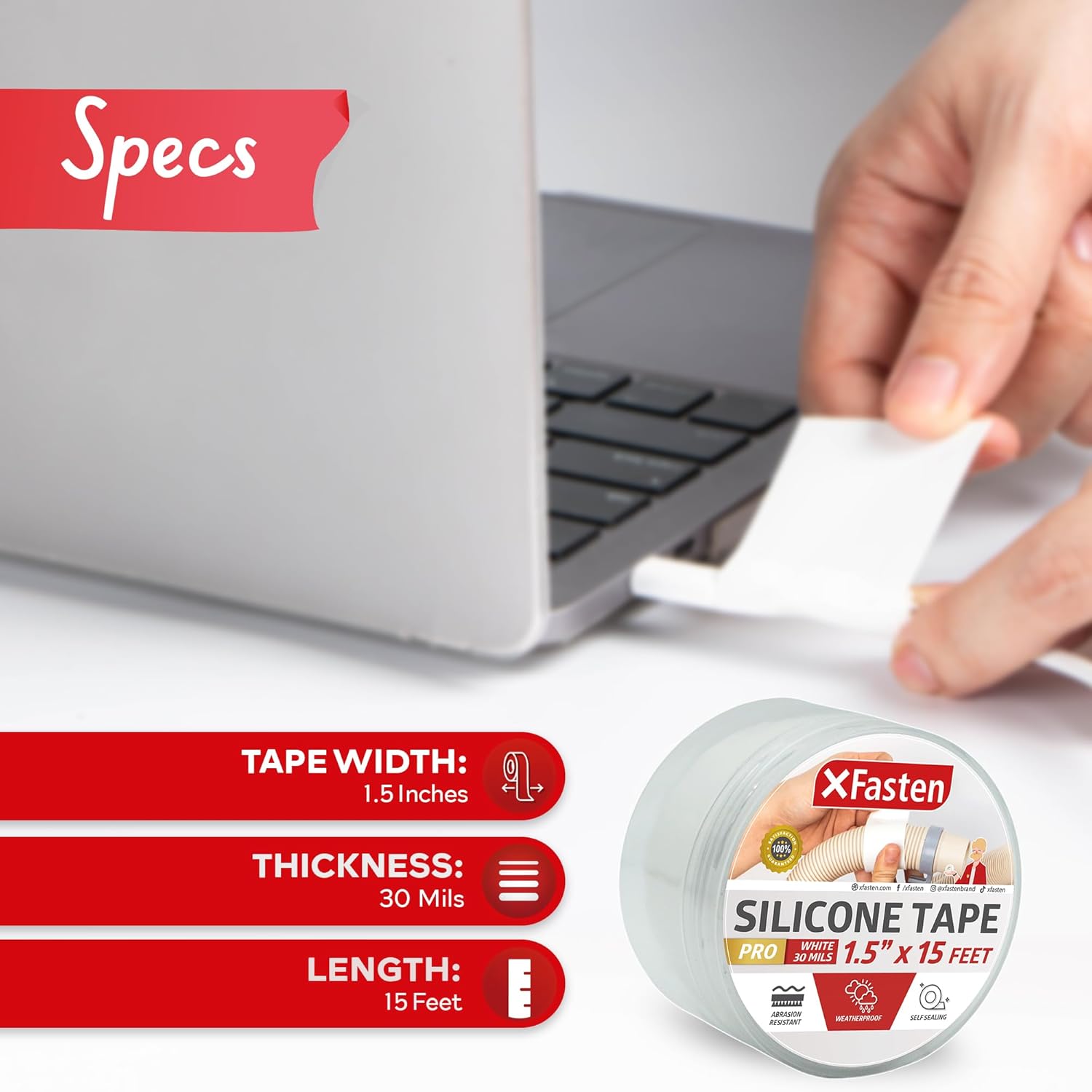 XFasten Self-fusing Silicone Tape Pro, White, 1.5-Inch x 15-Feet, 30mils Heavy-Duty Plumbing Tape for Leaks, Radiator Hose, Drain Pipes, Electrical Cords, and Garden Hose, High Pressure Resistant
