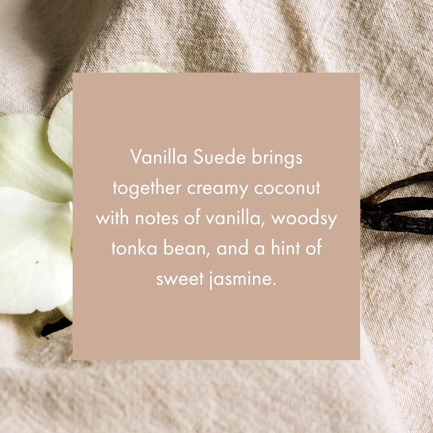 - SMOOTH, WARM, & LUSH. Vanilla Suede brings together creamy coconut with notes of vanilla, woodsy tonka bean, and a hint of sweet jasmine. The brightness of pink grapefruit and sunny mandarin lend a liveliness to the aroma for a fragrance full of the warmth and ease of a tropical paradise just waiting to be explored.