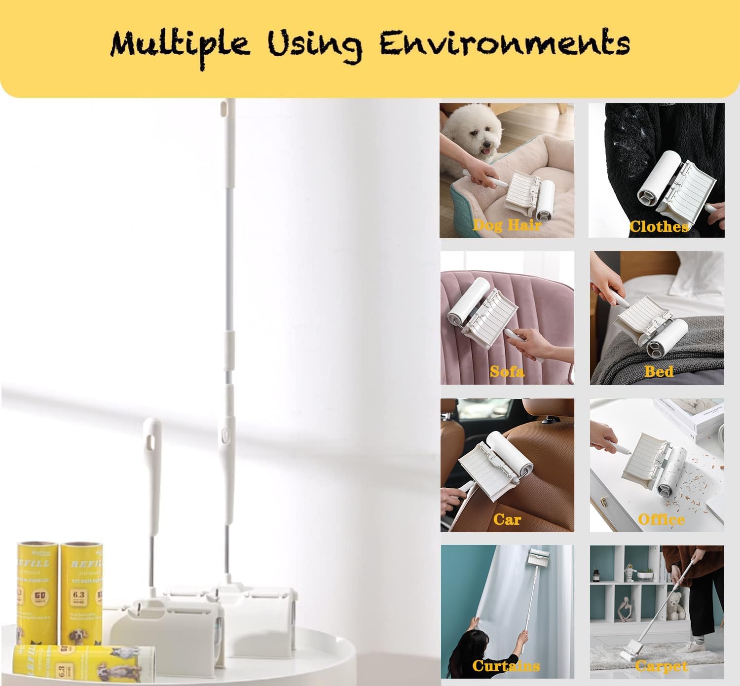 - š LARGE SURFACE, CLEAN MORE QUICKLY AND EFFICIENTLY: Large surface lint roller will serve as a perfect assistant in your home, office and car. Supersize 6.3'' lint roller with Easy Flip Cover consists of 4 Refills, total 240 sticky Sheets. It is extremely easy and effective for all surfaces; clothes, furniture, sofa, carpet, bed, curtains, hardwood floor etc. This large lint roller can remove cat/dog hair, lint crumbs, food debris, dust, glass slag and so on.