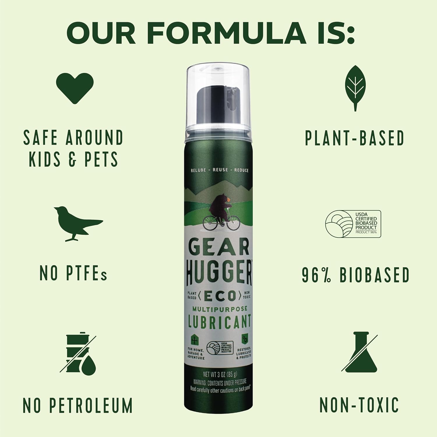 - ENVIRONMENTALLY FRIENDLY LUBRICANT THAT PROTECTS AND RESTORES WITHOUT HARMING OUR PLANET – A convenient 3-pack means you can always take it with you anywhere you need it! Make an eco-friendly choice with Gear Hugger to restore, lubricate and protect your gear so it functions optimally, lasts longer and stays out of the landfill. Gear Hugger means sustainability! Replace harsh odors, harmful petroleum and PTFE chemicals with our plant-based, non-toxic formula that’s USDA Certified 96% bio-based.