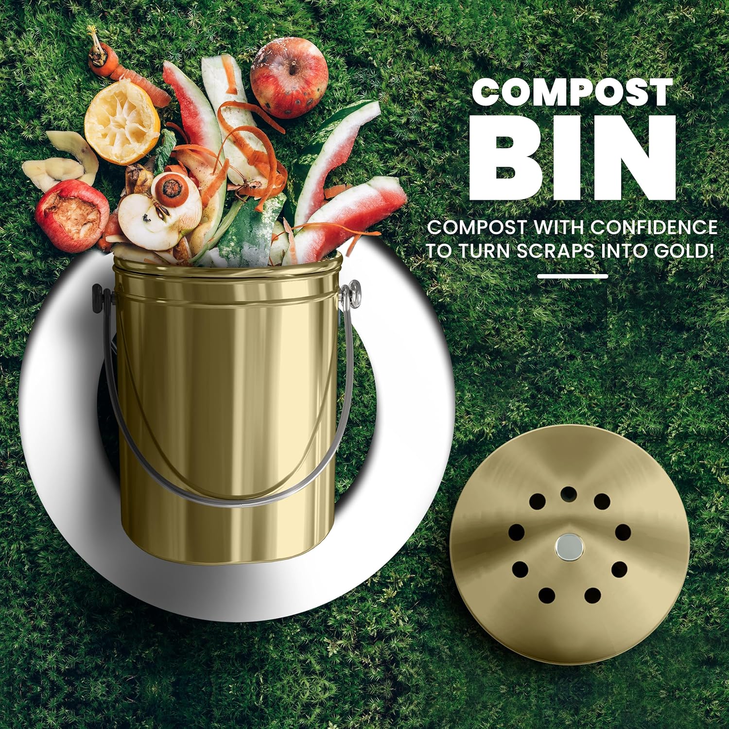 Utopia Kitchen Compost Bin for Kitchen Countertop - 1.3 Gallon Compost Bucket for Kitchen with Lid - Includes 1 Spare Charcoal Filter (Gold)