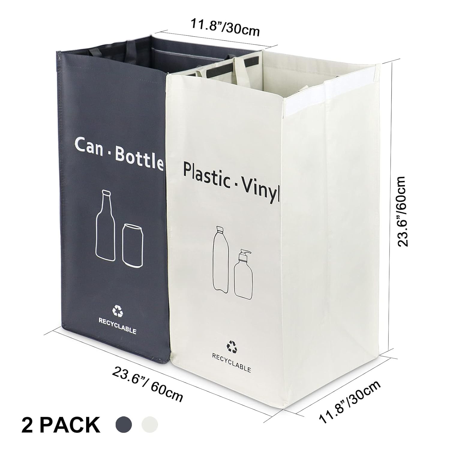 - DIMENSIONS: 11.8L x 11.8W x 23.6H(inch), 30L x 30W x 60H(cm). Set of 2 recycle bins classic colors and durable materials for use in offices, kitchens, bedrooms, storage rooms and more, and to keep these areas clean. They are deep enough to take a week's worth of recyclables for you. It is perfect for large families or offices