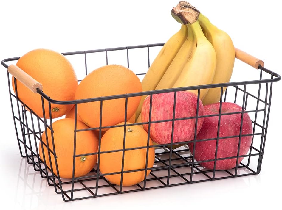 LeleCAT Wire Baskets with Wooden Handles Wire Storage Organizer Bin Baskets, Pantry, Closets, Bedrooms - Set of 2(Black)