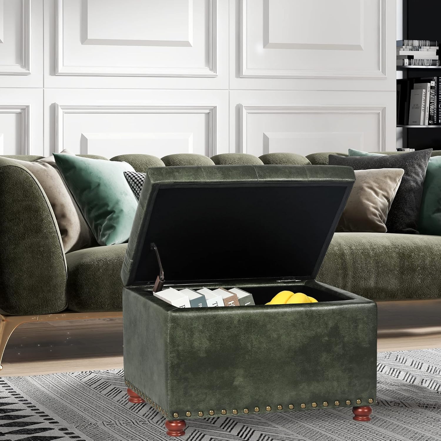 24'' Leather Ottoman with Storage Rectangle Foot Rest Ottomans Stool for Living Room(Green,Leather Texture)