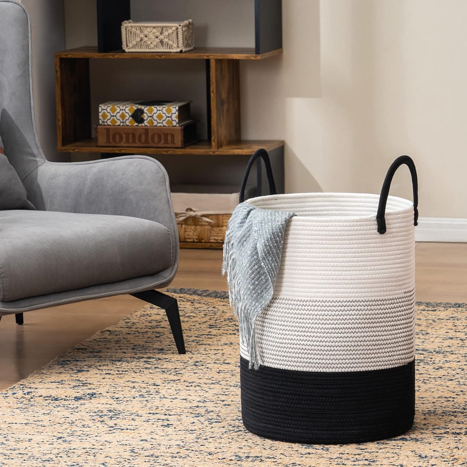 - 【Eco-friendly Tall Hamper】 16D x 22H inches tall round laundry hamper is 100% natural hand woven cotton thread rope has no plastics, harsh chemicals, toxins, or harmful additives. Perfect for clothes, blanket, throws and stuffed animals