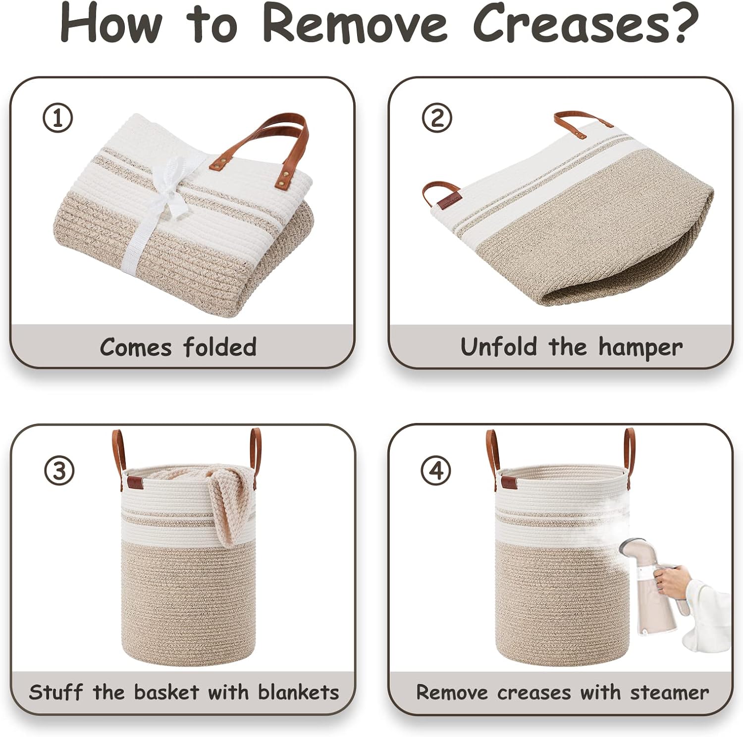 - ❤【WAY TO RESTORE ELEGANT SHAPE】 Our collapsible baskets are folded during shipping. Please fill the hamper with clothes or blankets for a period of time. If you want to remove creases from the surface of the tall basket, you can use a steamer.