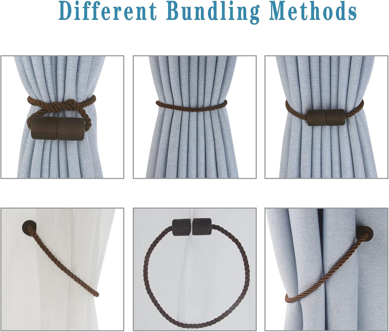 - High-Quality Materials- Magnetic curtain tie backs use an upgraded version of nickel-plated magnets, which are strong and smooth. The brightly colored twisted woven βtexture rope is hand-woven with premium polyester materials. very soft and good feeling. Beige/Gold/Black/White/Grey/Khaki/Coffee/Blue -Eight colors to choose from
