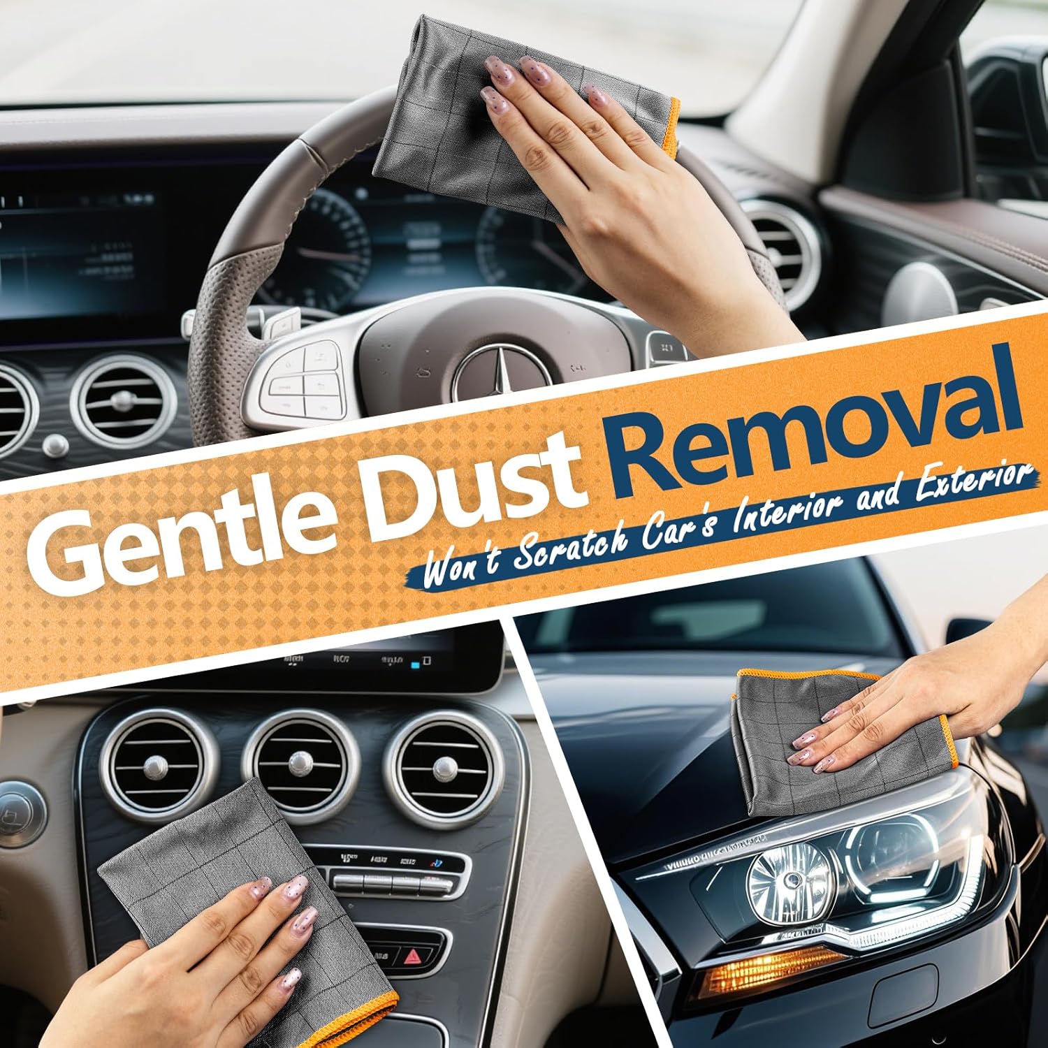 Airlab Carbon Microfiber Towels for Car Glass Window Polishing Cleaning Cloth Auto Detailing Lint Free Streak Free Drying Car Wash Towel, Pack of 3, 12" x 12", Grey-Orange