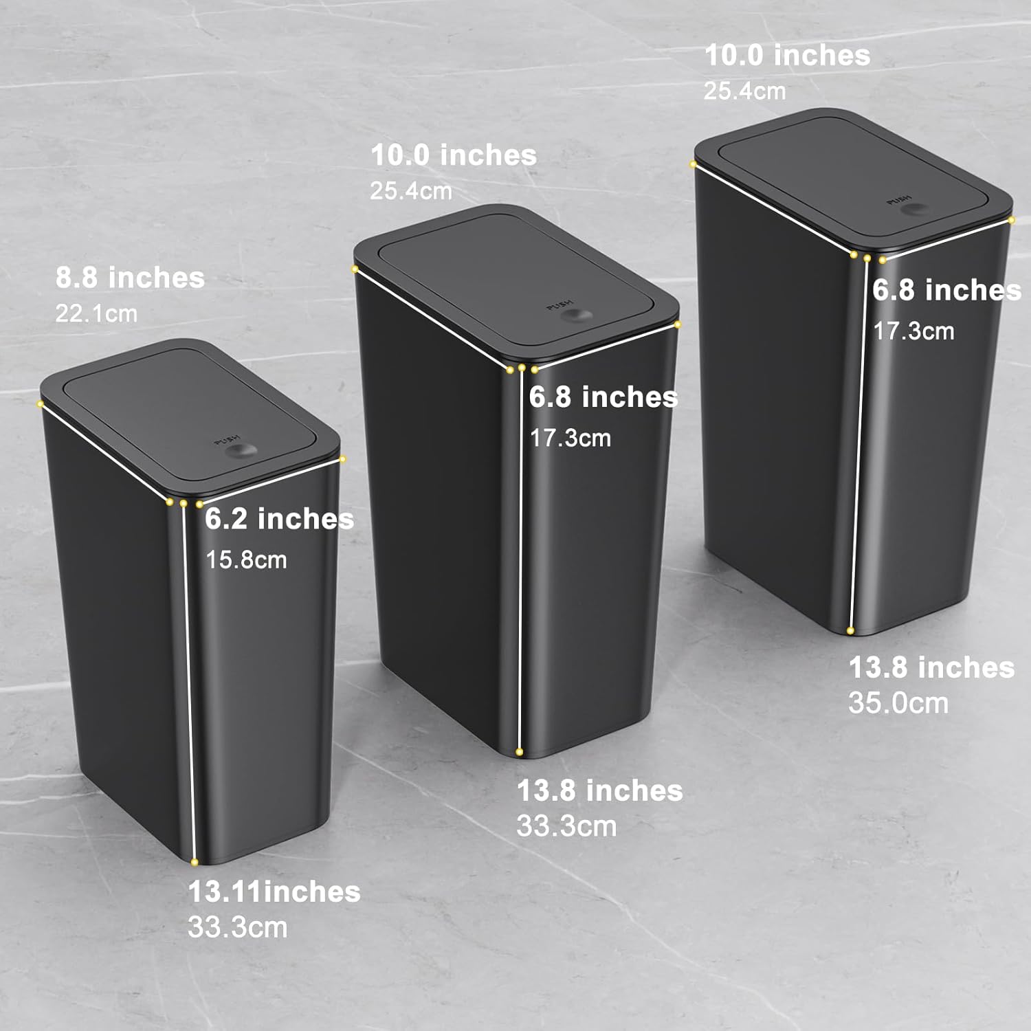 - Modern Look and Space-Saving Small Garbage Can: This kitchen garbage can with lid has slim design, it takes up very little space, making them great for small bathrooms and kitchens whereas small waste basket for bathroom is large enough to hold plenty of garbage and debris. The sleek and modern look on our bathroom trash can with lid, small trash can, office trash can, bedroom trash can, bathroom garbage can with a lid math any décor. Our small garbage cans for kitchen are your great choice
