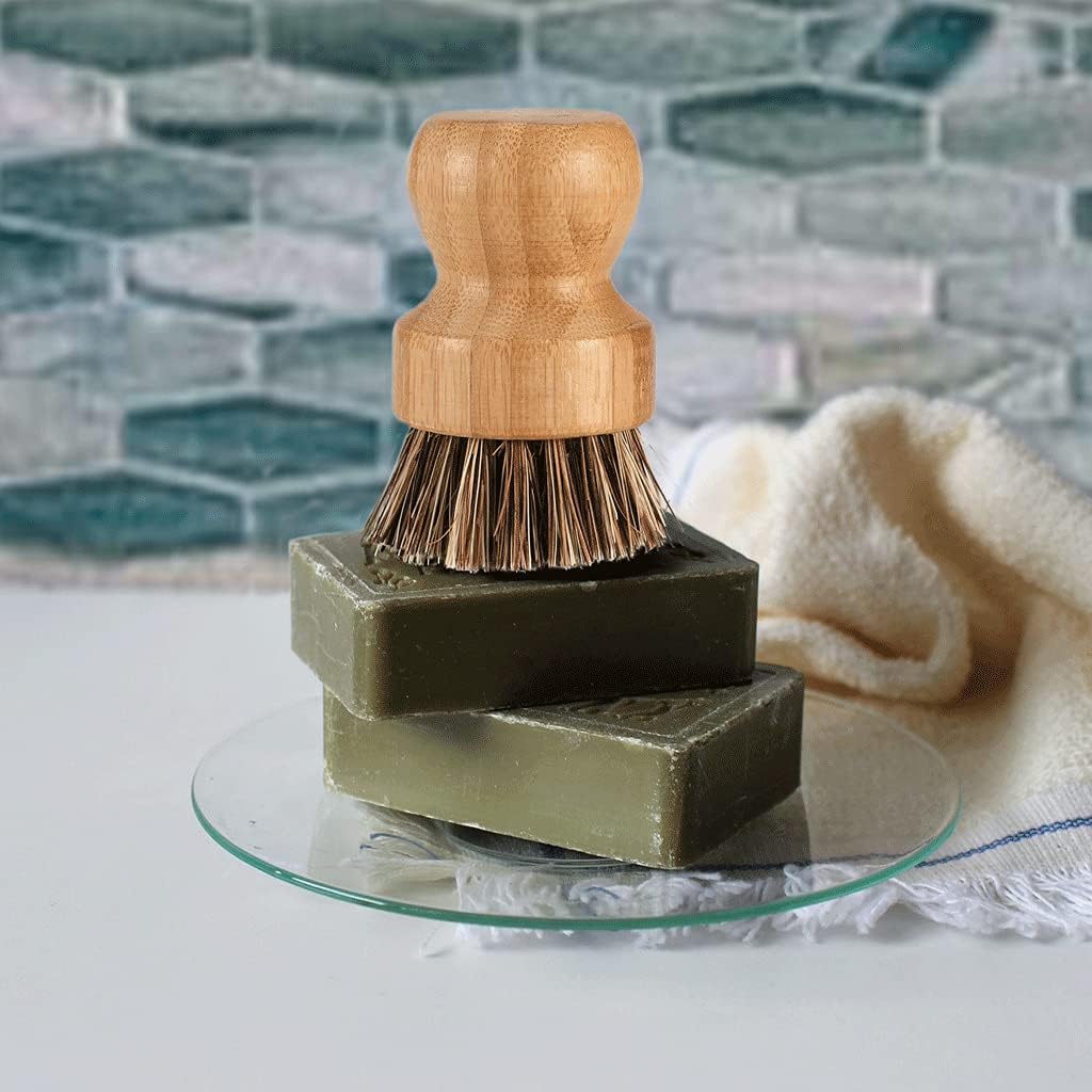 - Heat-proof Natural Bristles - The brushes are perfect having 2 different ones for types of scrubbing you need to do. The brown bristle is made from very stiff palm/coconut fibers, it's great to scrub baked on gunk off the stainless steel pan or carbon steel wok quickly, can easily remove dried food off the plates. The white bristle is made from medium stiff Tampico/sisal bristles, ideal for cleaning non-stick pans and safely scrubbing your cast iron skillet in hot water without soap.