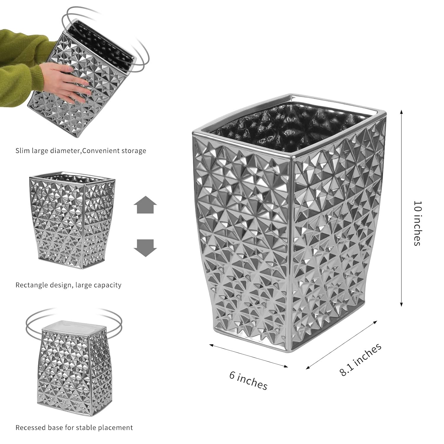 - Polygonal Silver Plating Design :Rectangular, open top garbage cans fit nicely under the desk, in the kitchen cabinet or in between tight spaces.