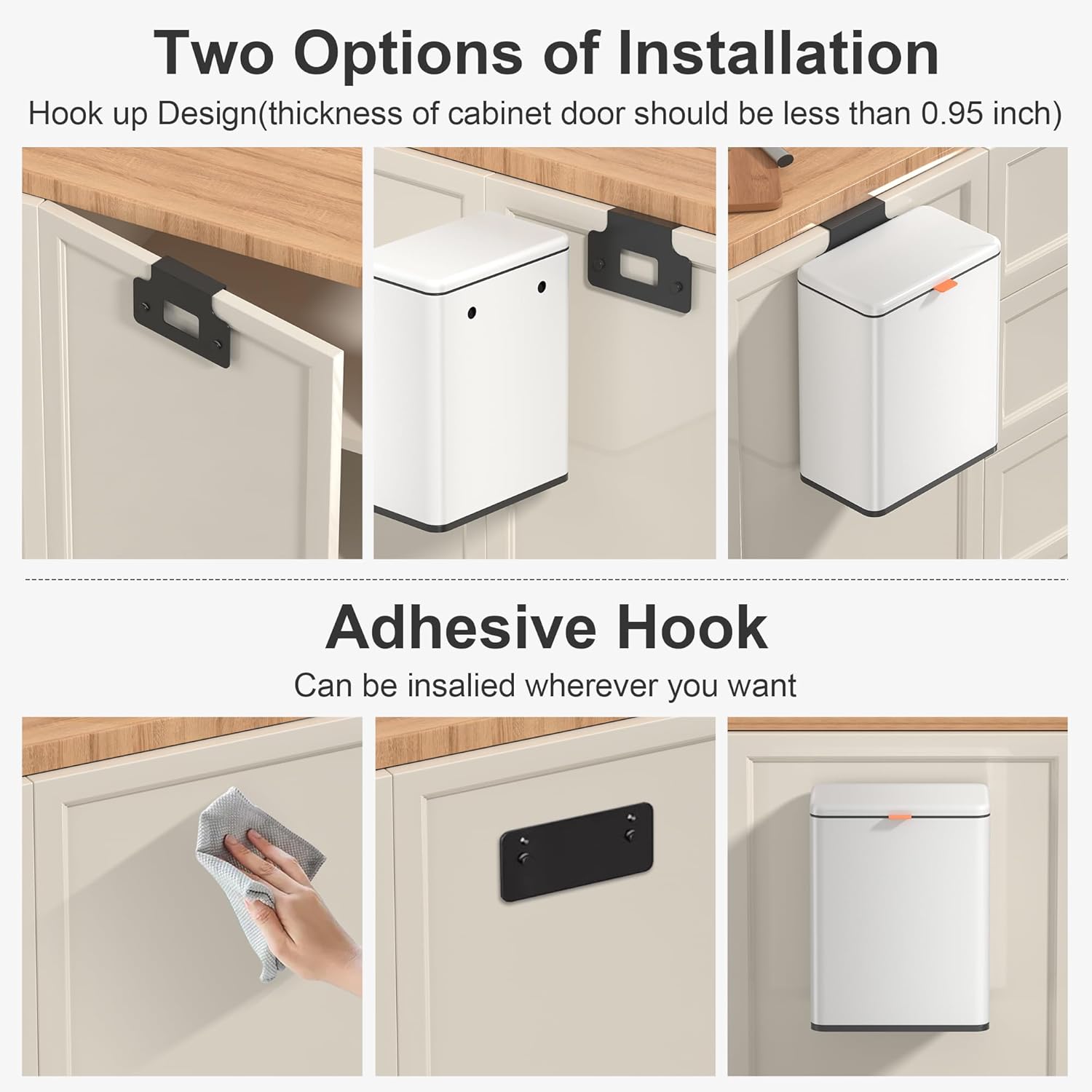 - 【WALL MOUNTED/COUNTERTOP/ UNDER SINK TRASH CAN】: No need to bend over. The trash can provide Two opening and installation methods,Effortless and Fits for Most Cabinet Doors, Pantry Doors. The thickness of door should be less than 0.98" (2.5cm). Small trash can can also be glued on kitchen or bathroom wall or under the sink.