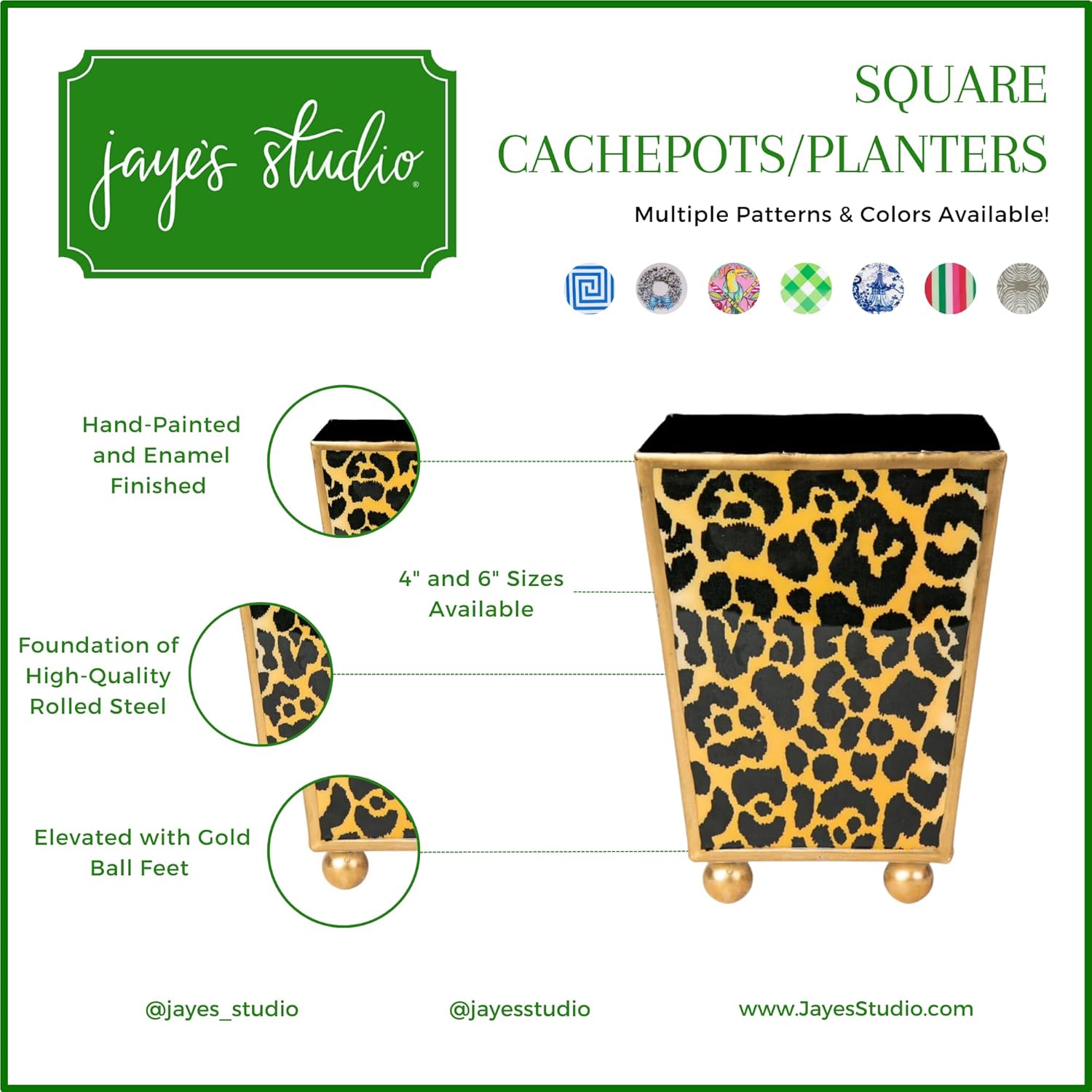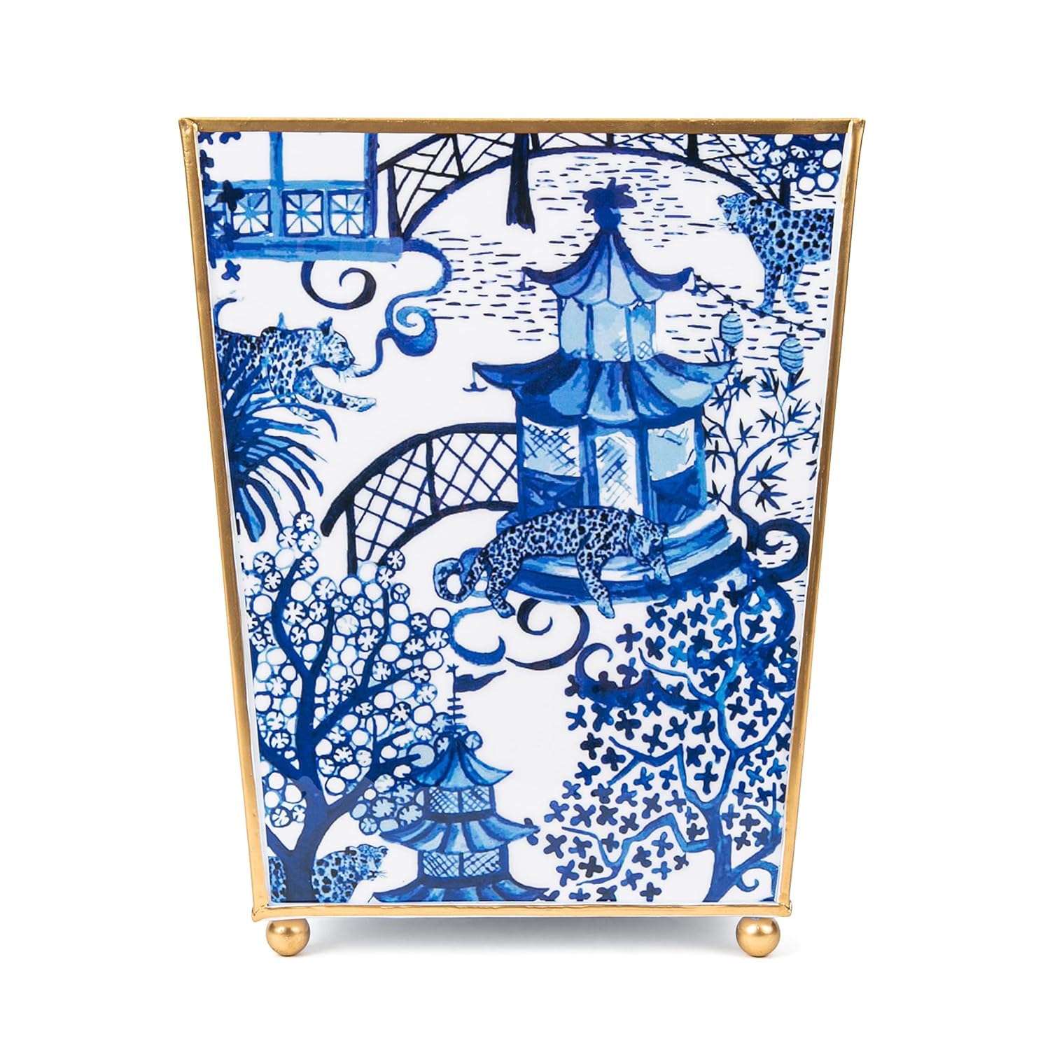 Jaye’s Studio Garden Party Decorative Gold Waste Basket for Bathroom Trash Can no Lid, Bedroom Garbage Can Square Office Trash Bin, Vanity Enamel White & Blue Bathroom Trash Can Gold Feet, 9 inch Wide
