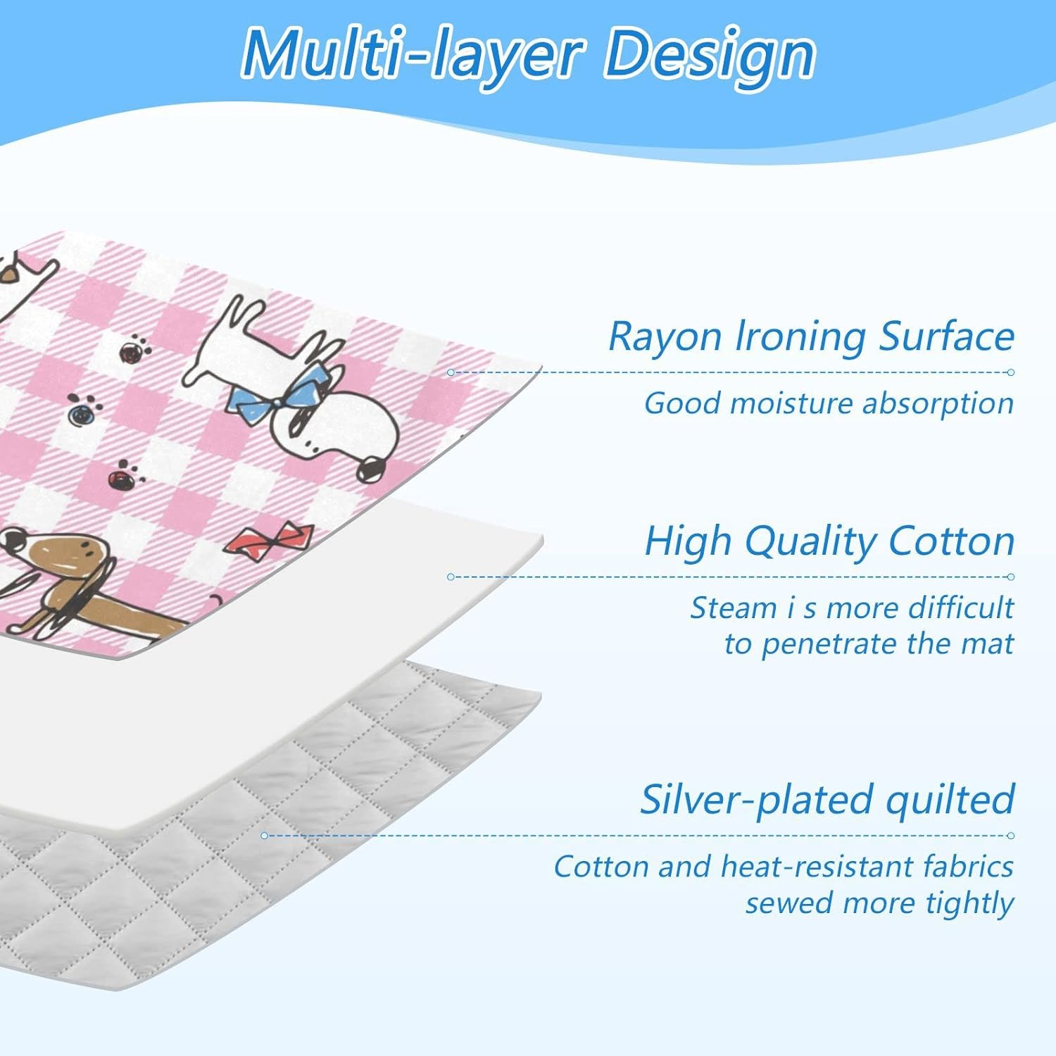 - Material: Our ironing mat for table top has 3 layers, rayon ironing surface + high quality cotton + silver-plated quilted fabric, making it durable to use