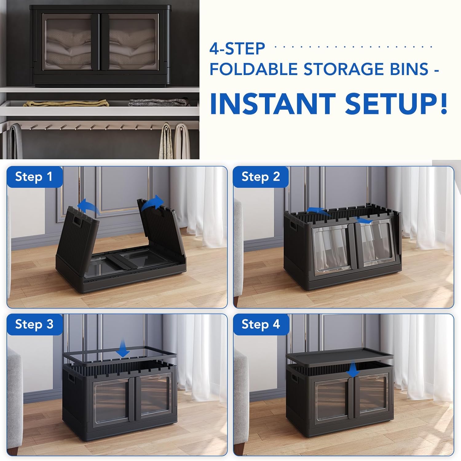 - Instant Foldable Storage Bins With 3 Lids: Each storage bin can be used independently or stacked upwards. These 228 QT collapsible storage bins with lids require no tools for installation and can be ready for use in as little as 10 seconds. When not needed, they can be easily folded and stored under the bed or couch or in any corner, taking up very little space.