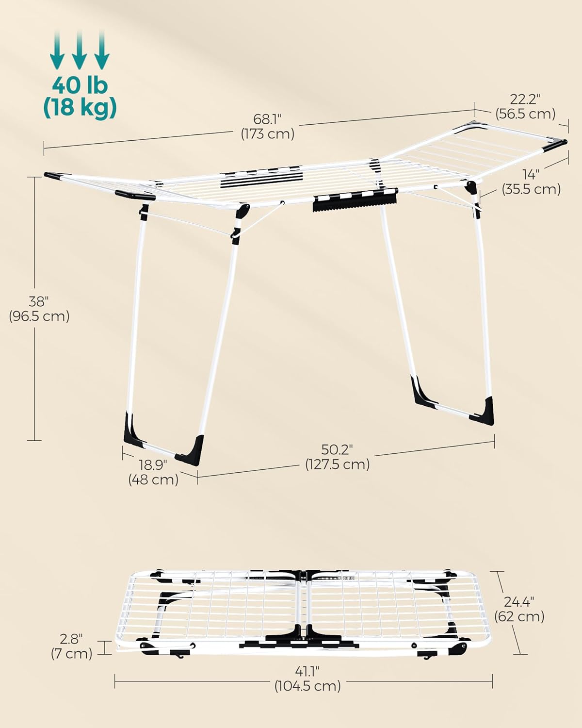 - [Capacity and Strength United] What you get is a 59 ft of drying space with a maximum weight capacity of 40 lb, and 2 sock clips are included. Effortlessly accommodate everything from small delicates to bulky linens, making laundry day a breeze