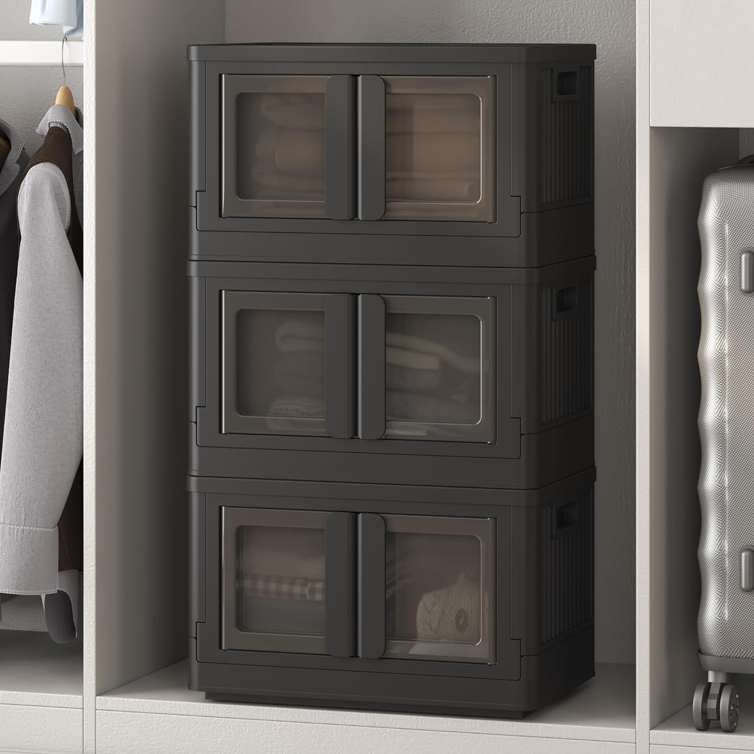 FLEXIMOUNTS 110 QT Stackable Storage Bins With Lids, Collapsible Plastic Storage Bins With Doors and Built-in Wheels For Home Dorm Closet Organizers and Storage, 3 Pack Cubes, Black