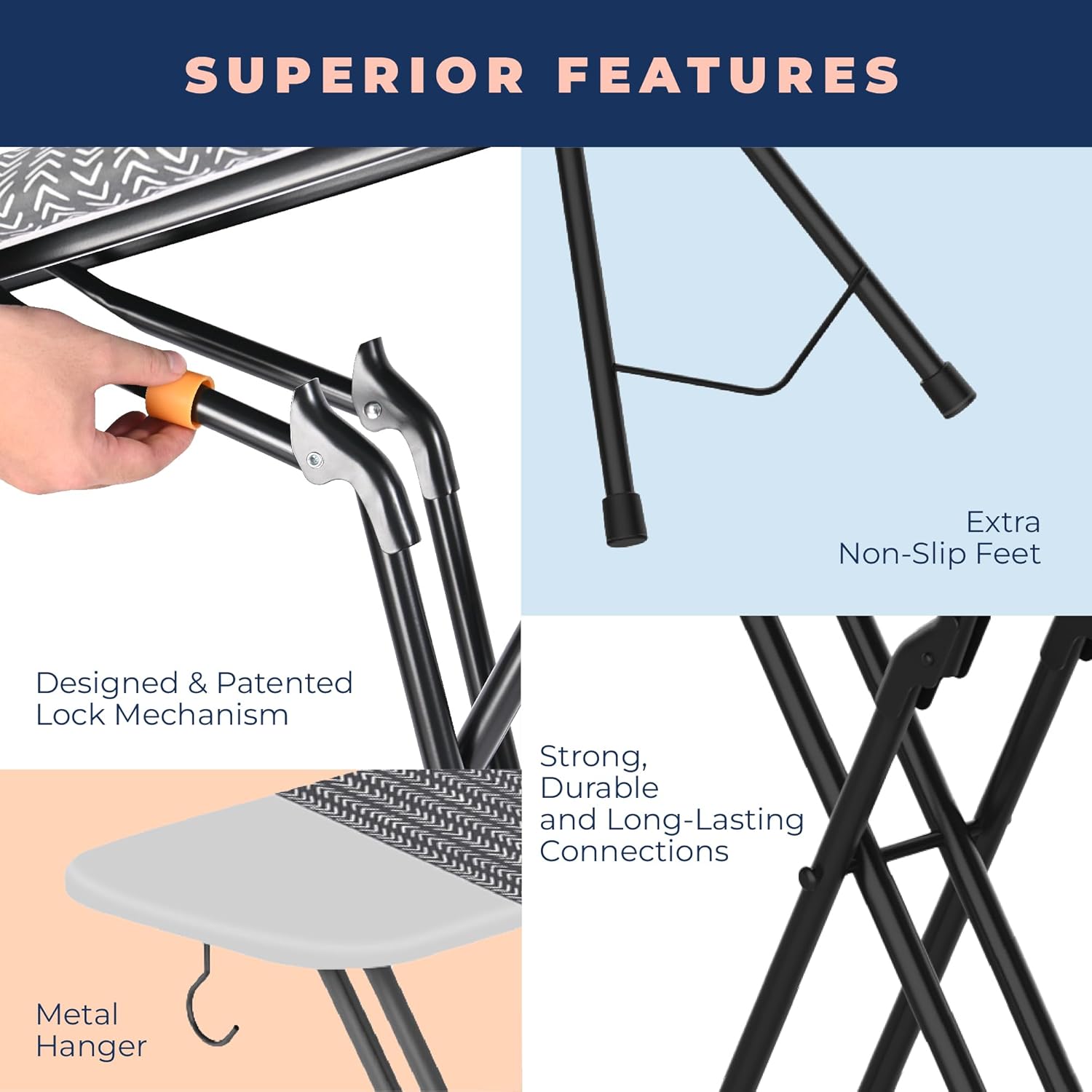 Happhom Ironing Board, Compact and Space Saver Iron Board, Safety Ironing with Park Zone and 4 Layers Extra Thick Cover, Patented Lock System for Foldable Leg, Easy Storage with Smart Hanger (13x43)