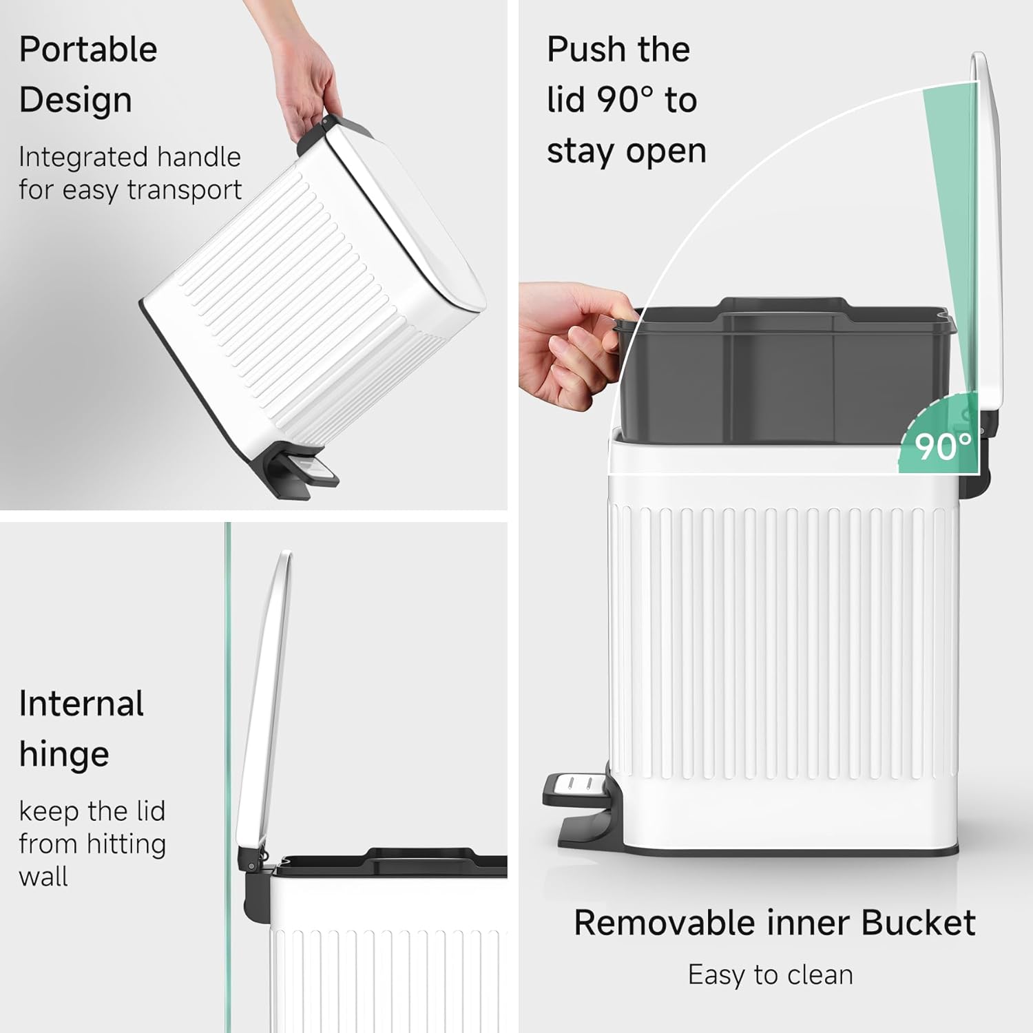 - Removable Inner Wastebasket: The inner bucket of the small trash bin can be easily removed to clean or waste disposal. The hole designed inside the bucket helps lock the garbage bag in place and hide extra trash bag