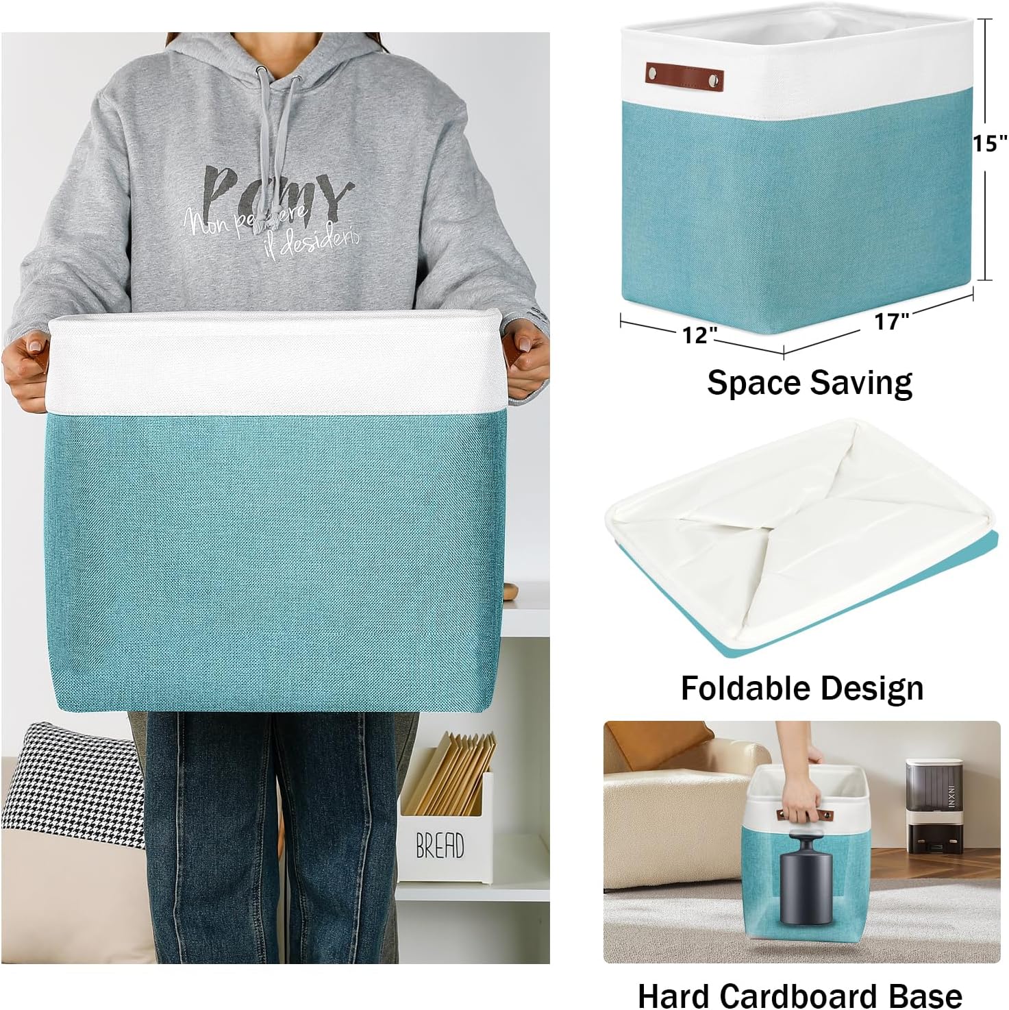 DULLEMELO Extra Large Storage Baskets, Fabric Storage Bins for Organizing Shelves Nursery Toys Books, Closet Baskets and Bins with Handles, White&Teal, 2-Pack