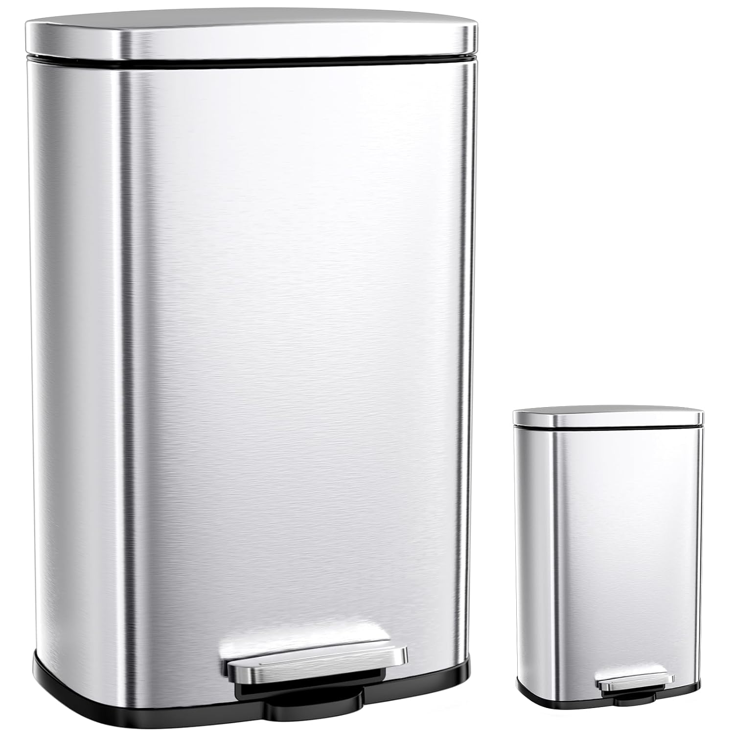 Arlopu 13.2+1.3 Gallon Step Trash Can, Stainless Steel Garbage Bin, Soft-Close Rubbish Bin with Removable Plastic Inner Bucket, Fingerprint-Proof, Lid Dustbin, for Kitchen Home (Silver)