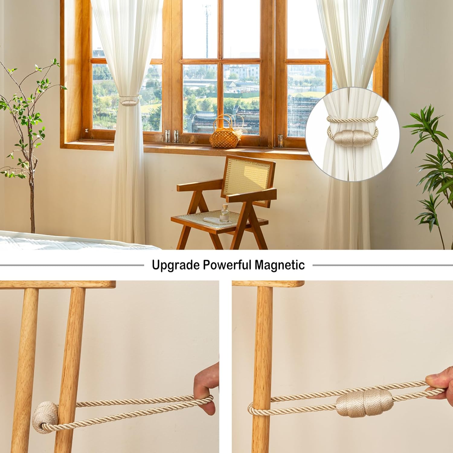 Magnetic Curtain Tiebacks - Rope Tiebacks for Curtains & Drapes, Decorative Window Holdbacks (2 Pack, Beige)
