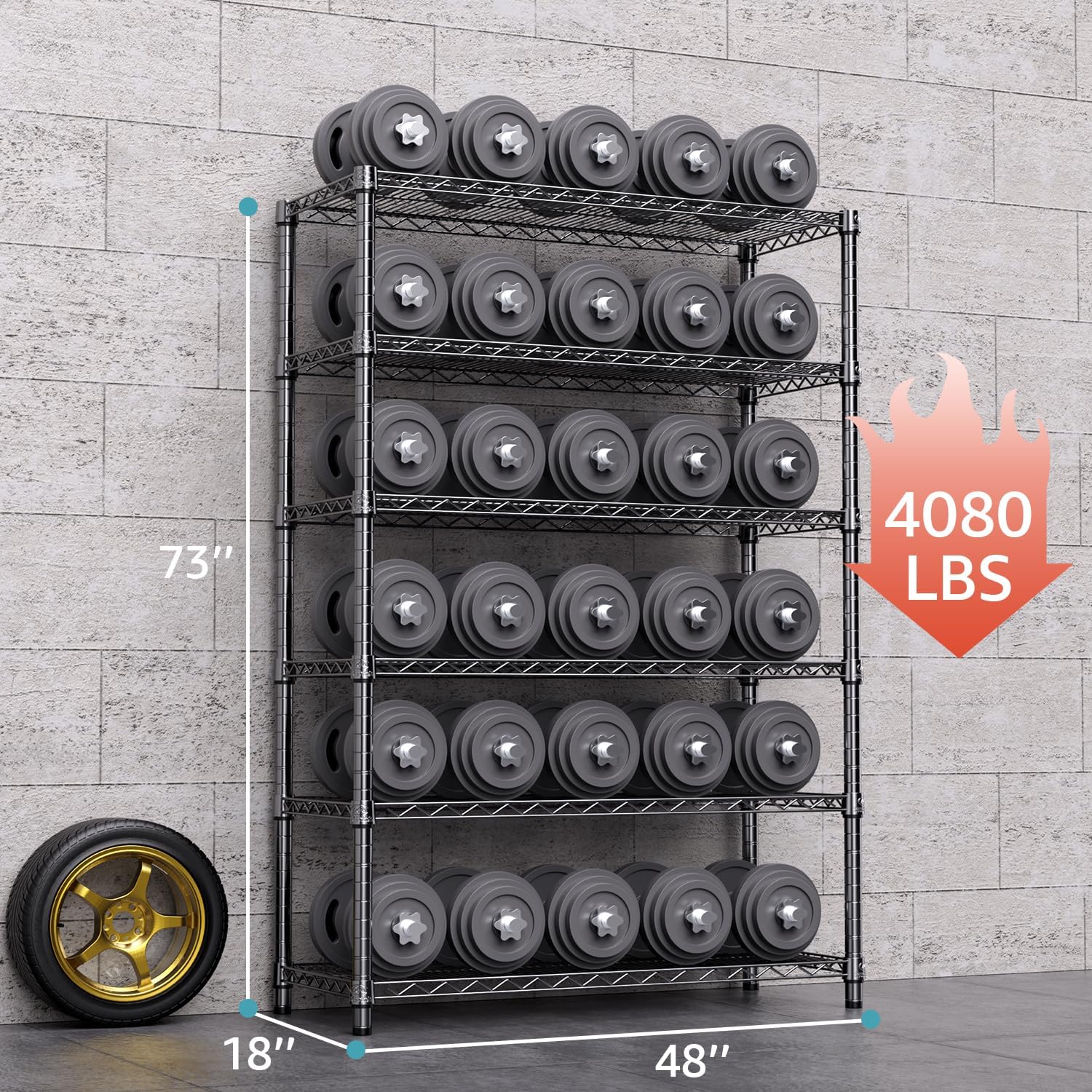 - ăSTABLE AND DURABLEăCrafted from premium Carbon Steel and reinforced with 25.4mm pipes, this wire shelving unit (17.7"D x 47.2"W x 72.3"H ) ensures stability. Each shelf showcases a weight-bearing capacity of 680 pounds, while the entire unit can support up to 4080 pounds on feet/600 pounds on wheels.