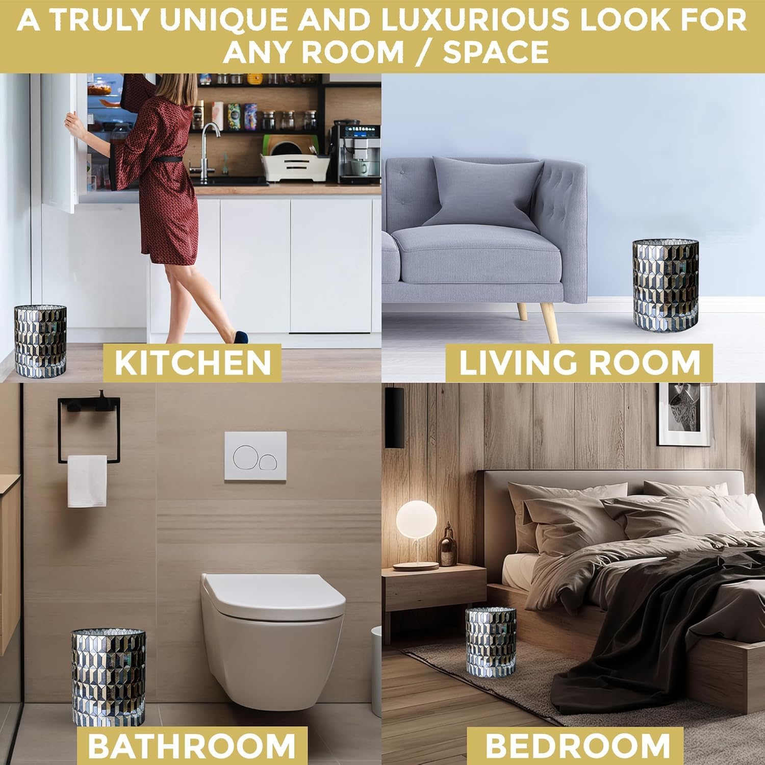 - Premium Small Garbage Can - Our decorative bathroom trash cans are hand-made with a beautiful mosaic glass finish for black/gold-themed decor. A must-have in your new house essentials for a luxurious bathroom experience.