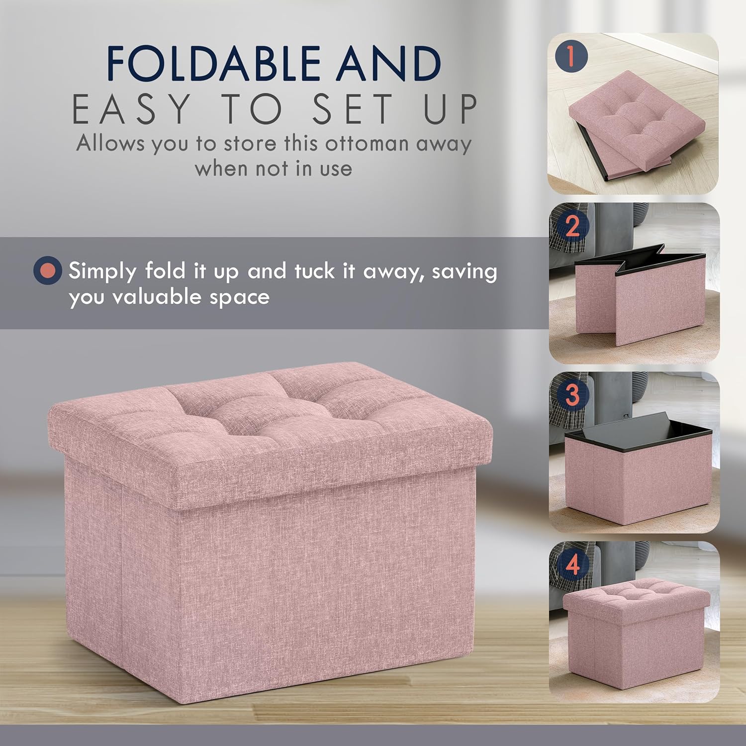 Ornavo Home Small Storage Ottoman Foldable Collapsible Rectangle Linen Ottoman Foot Rest Stool Seat, for Living Room, Bedroom, Home Office, Dorm - 12 x 16 x 12, Pink