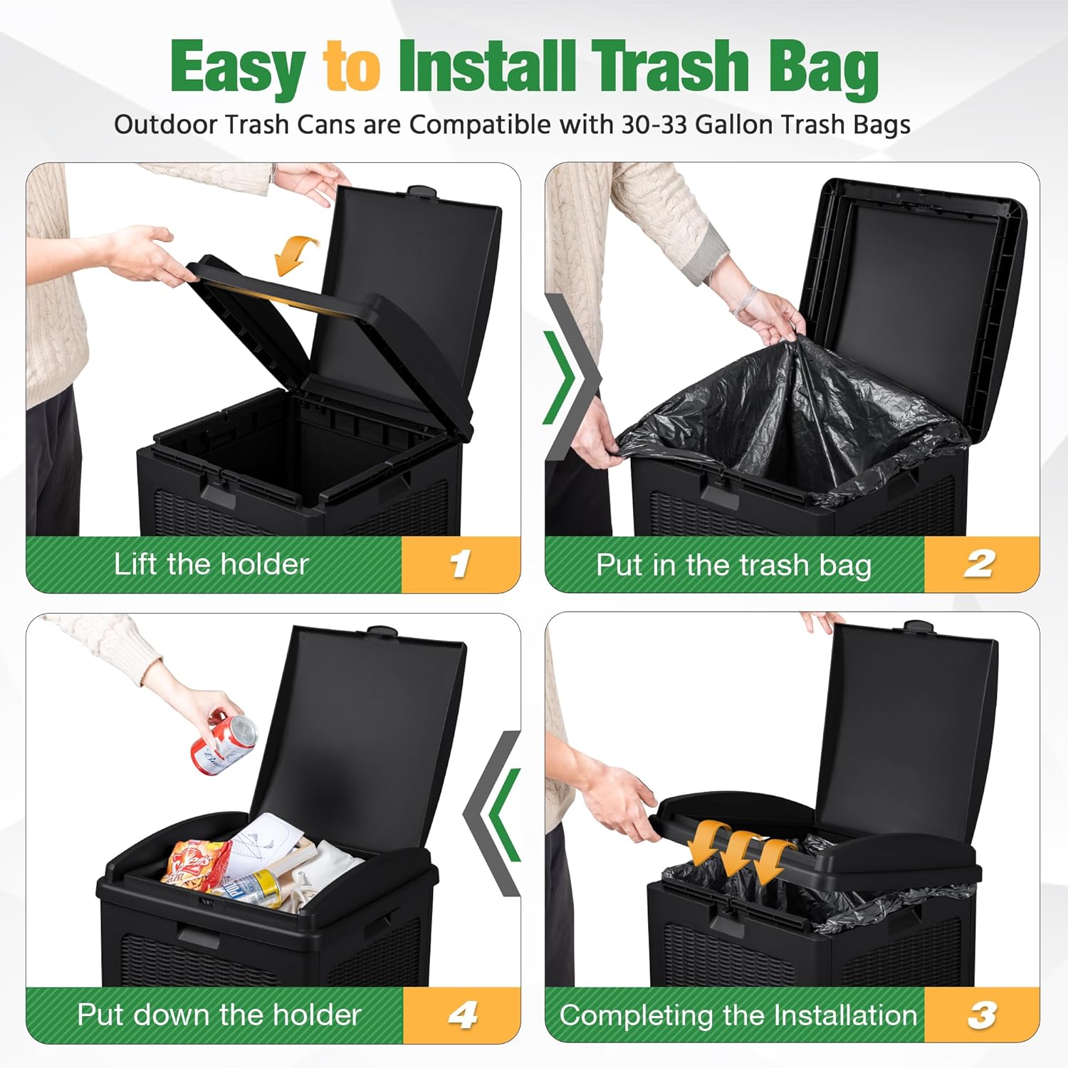 - Easy to Install Trash Bags: The waste bin for outdoors is compatible with 30-33 gallon trash bags. You need to lift the trash bag holder, put on the trash bag, put down the holder, and then finish the installation. After opening the inner lid, the garbage bag can be stably fixed in the card slot.