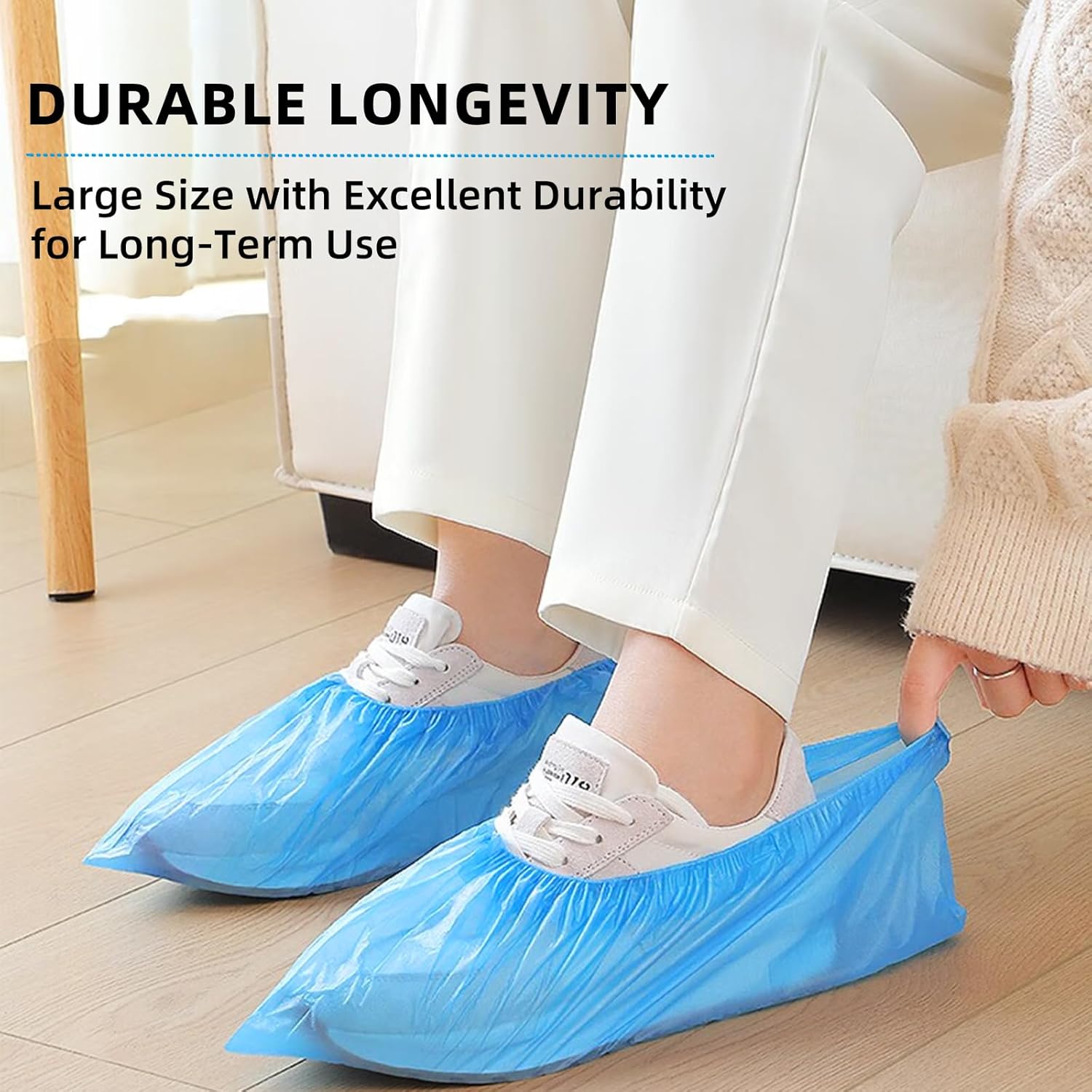 - 【Generous Sizing】This pack of 200 disposable plastic shoe covers features a generous size, fitting men's shoe sizes 6 to 14 in the US. Whether you're wearing boots or work shoes, slipping these on is a breeze.