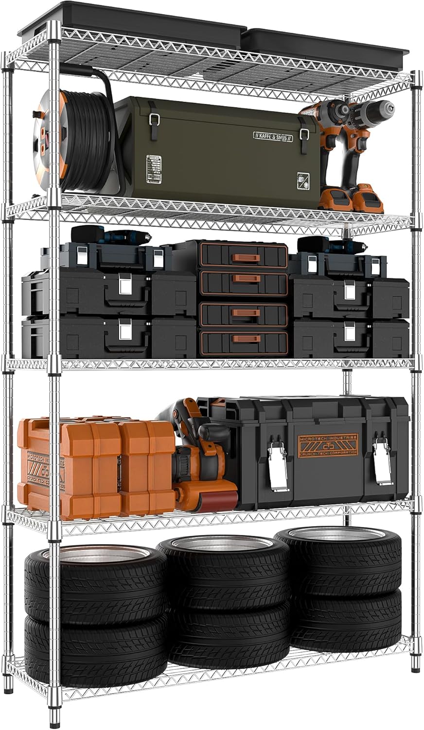 MZG 1750 lbs 5 Tier Storage Rack Metal Wire Shelving Unit, Storage Standing Household Shelf Organizer for Kitchen Pantry Closet Garage Basement Utility Room, Chrome 15.8" D x 45.3" W x 70.4" H