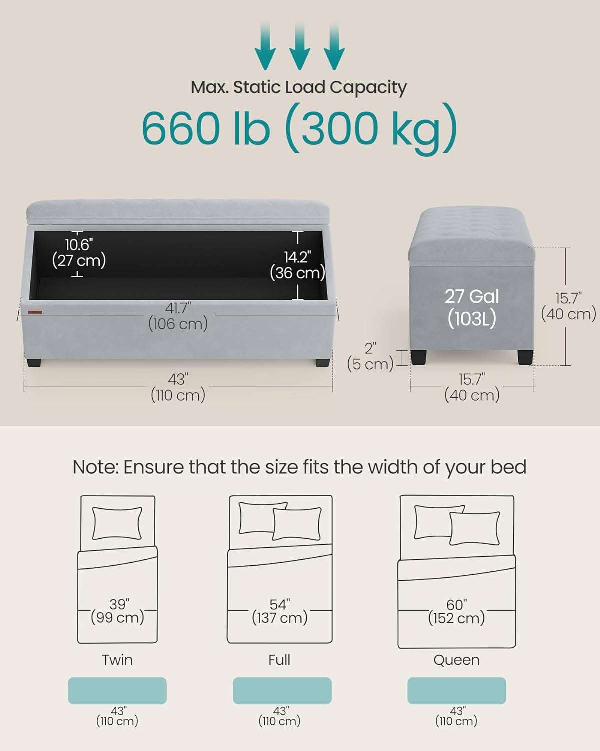 - 【SPACIOUS STORAGE】Sized at 15.7"D x 43"W x 15.7"H (40 x 110 x 40 cm), this bench offers a 27-gallon (103 L) volume for your blankets, books, and bed sheets