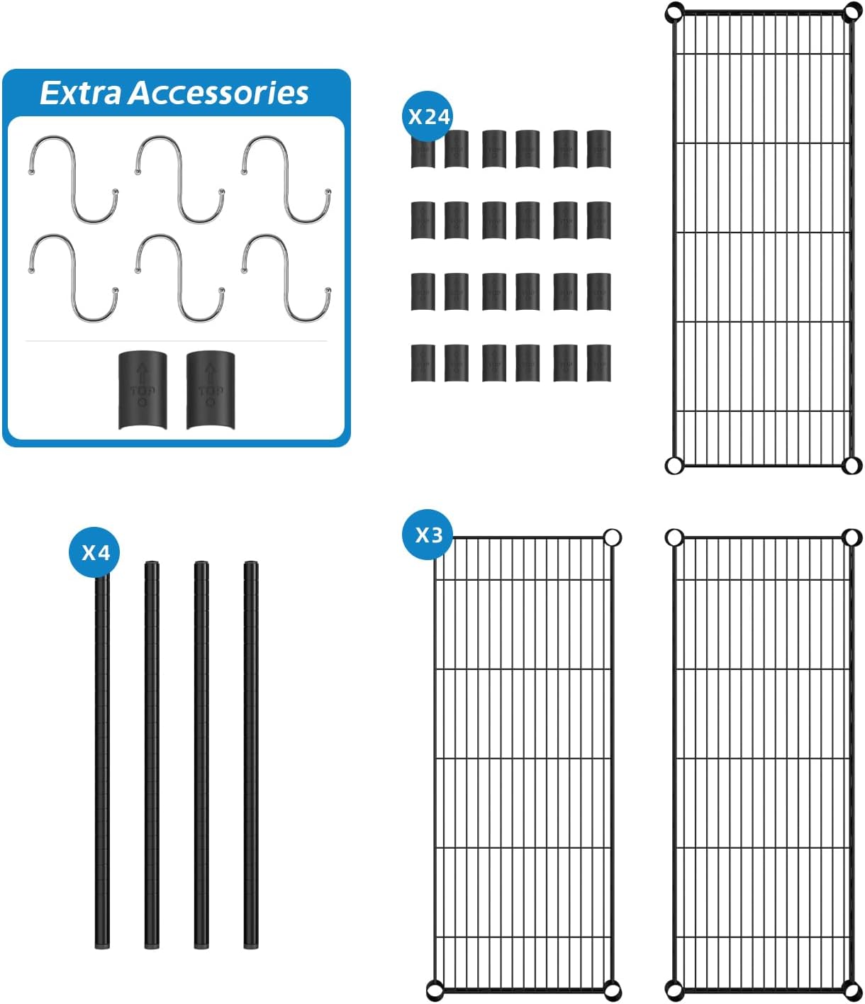 - What You Will Get:This Wire Shelving include: 3 pieces of metal mesh, 4 uprights, 24 clips; an additional 2 clips and 6 metal hooks are included