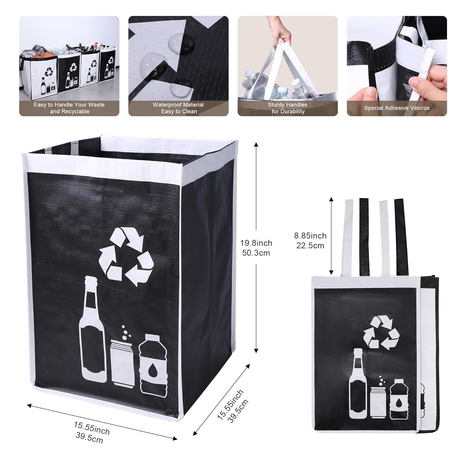 - Package Contain: Two high quality recycling waste bags can be folded and stored without taking up space, easy to carry. Large capacity allows you to organize items perfectly, sorting recyclable cans, paper, glass and plastic, ect. Size: 15.5 LĂ 15.5 WĂ 19.8 H