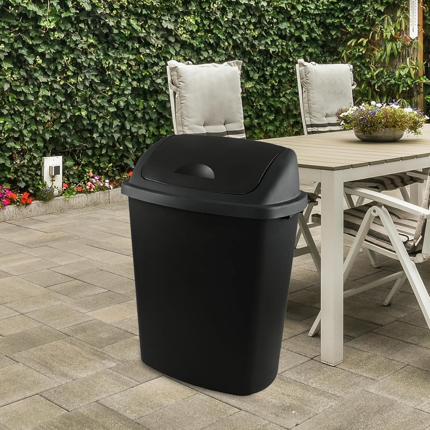 - Large plastic swing top trash can, with 18 gallon capacity, ideal for indoor or outdoor use