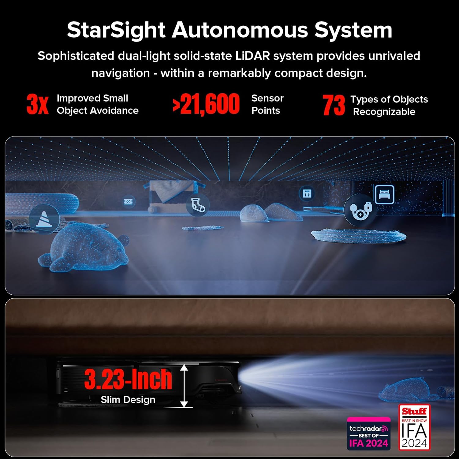 - StarSight Dual Light Solid-State LiDAR - As Roborock's latest innovation, the system provides a comprehensive 3D understanding of the surroundings, enabling precise navigation with pinpoint precision and accurate mapping, even in challenging areas, such as under suspended cabinets and around thin-legged furniture. Powered by 3D sensors that capture precise outlines of obstacles and an RGB camera for visual recognition, Roborock Qrevo Slim swiftly recognizes and evades 73 types of objects