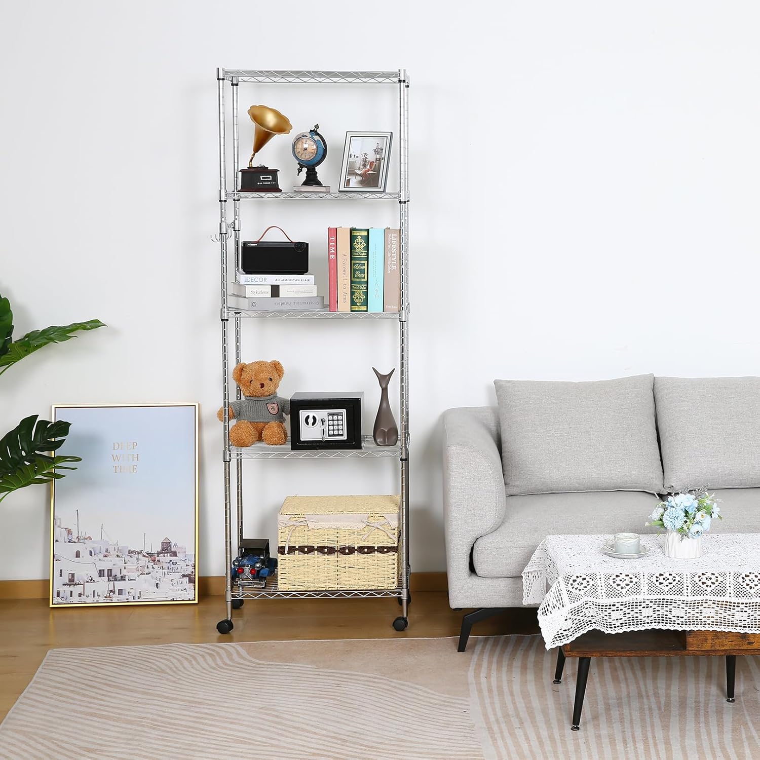 - ăPremium Corrosion-Resistantă5 Tier storage shelf is made of sturdy carbon steel, equipping with an advanced powder coating process, the shelf is rust resistant and oxidation resistant.Enables you to use it longer