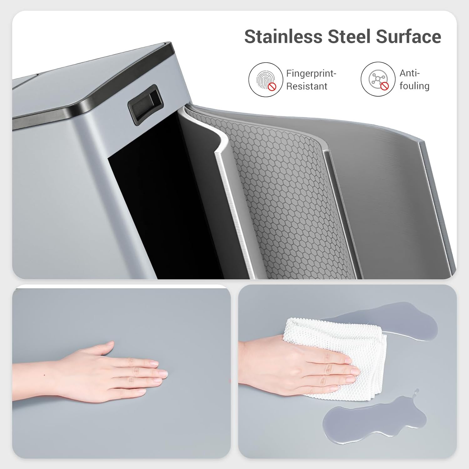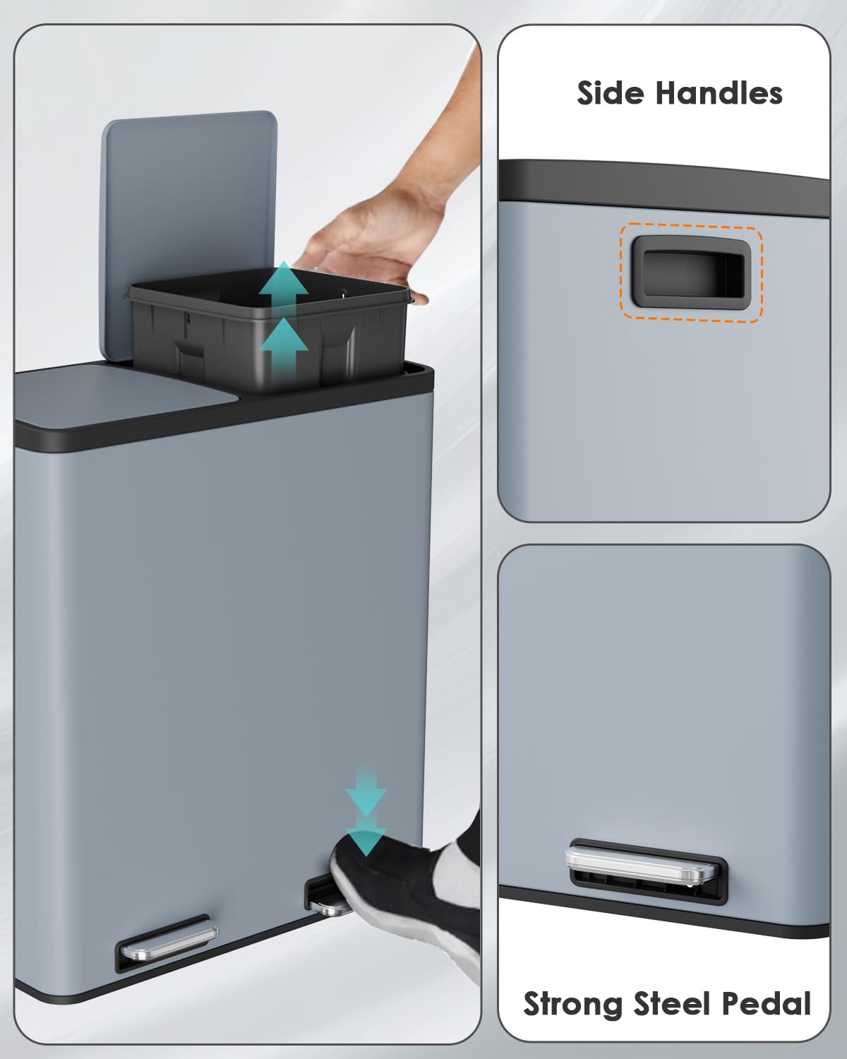 - 2*8 GALLONS COMPARTMENTS: Trash can has two independently compartments for trash and recyclables, making it easy to sort waste.
