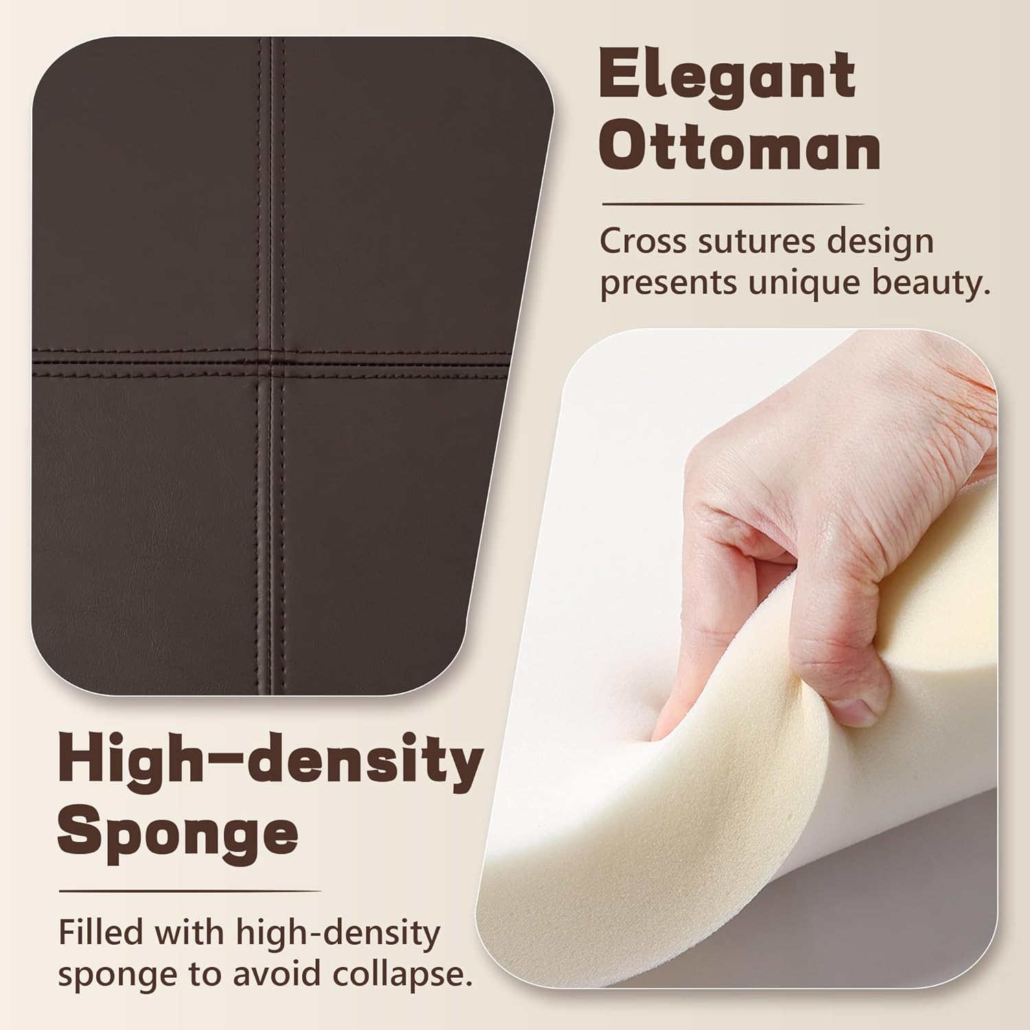 - Exquisite Design: PU leather fabric and hand-stitched top design gives this ottoman coffee table an elegant appearance. There is enough high-rebound sponge inside the top, which keeps the ottoman full and beautiful. Removing the things from top will not leave ugly indentations