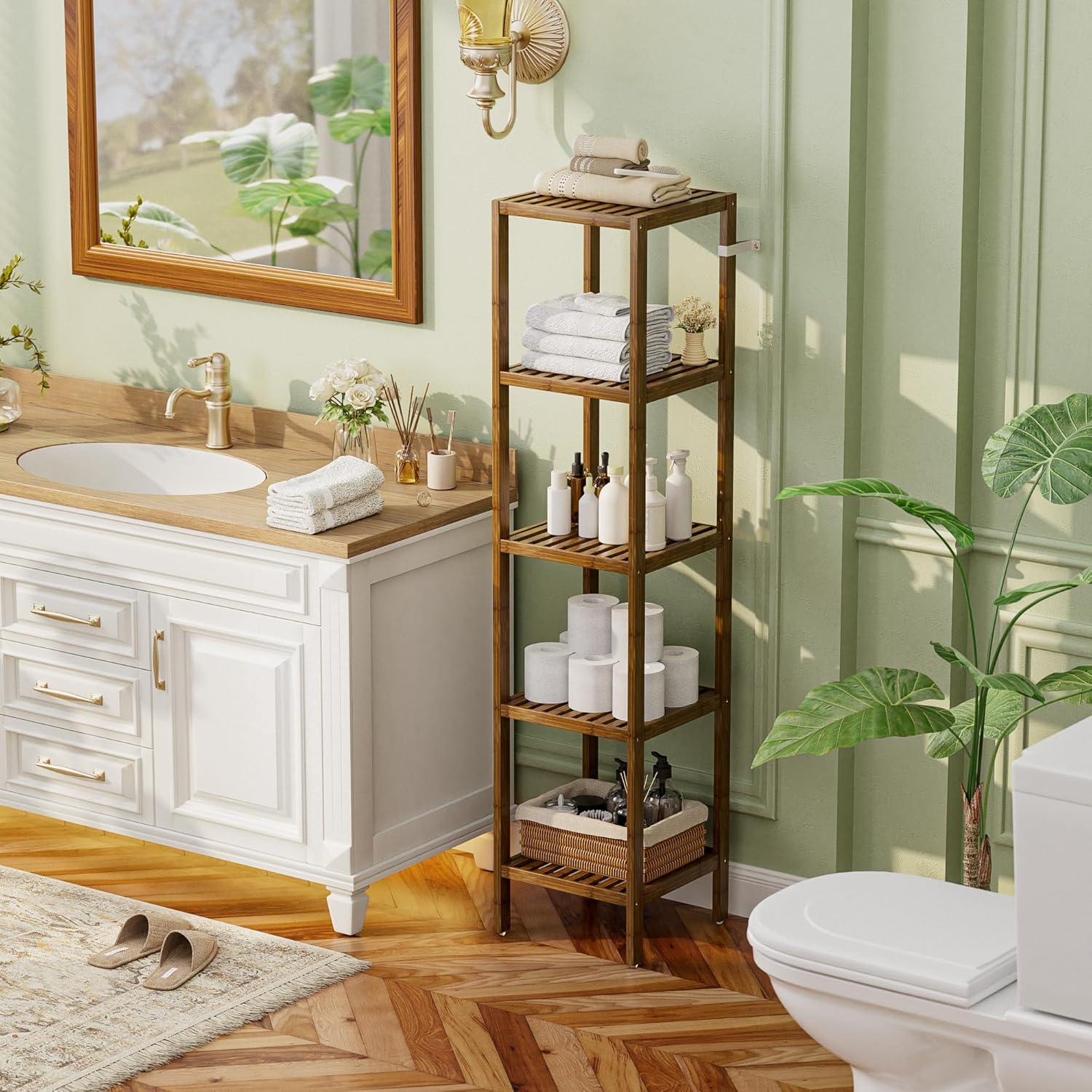 SMIBUY Bathroom Storage Shelf, 5-Tier Bamboo Rack Organizer, Multifunctional Shelving Unit for Living Room Bedroom Kitchen (Walnut)