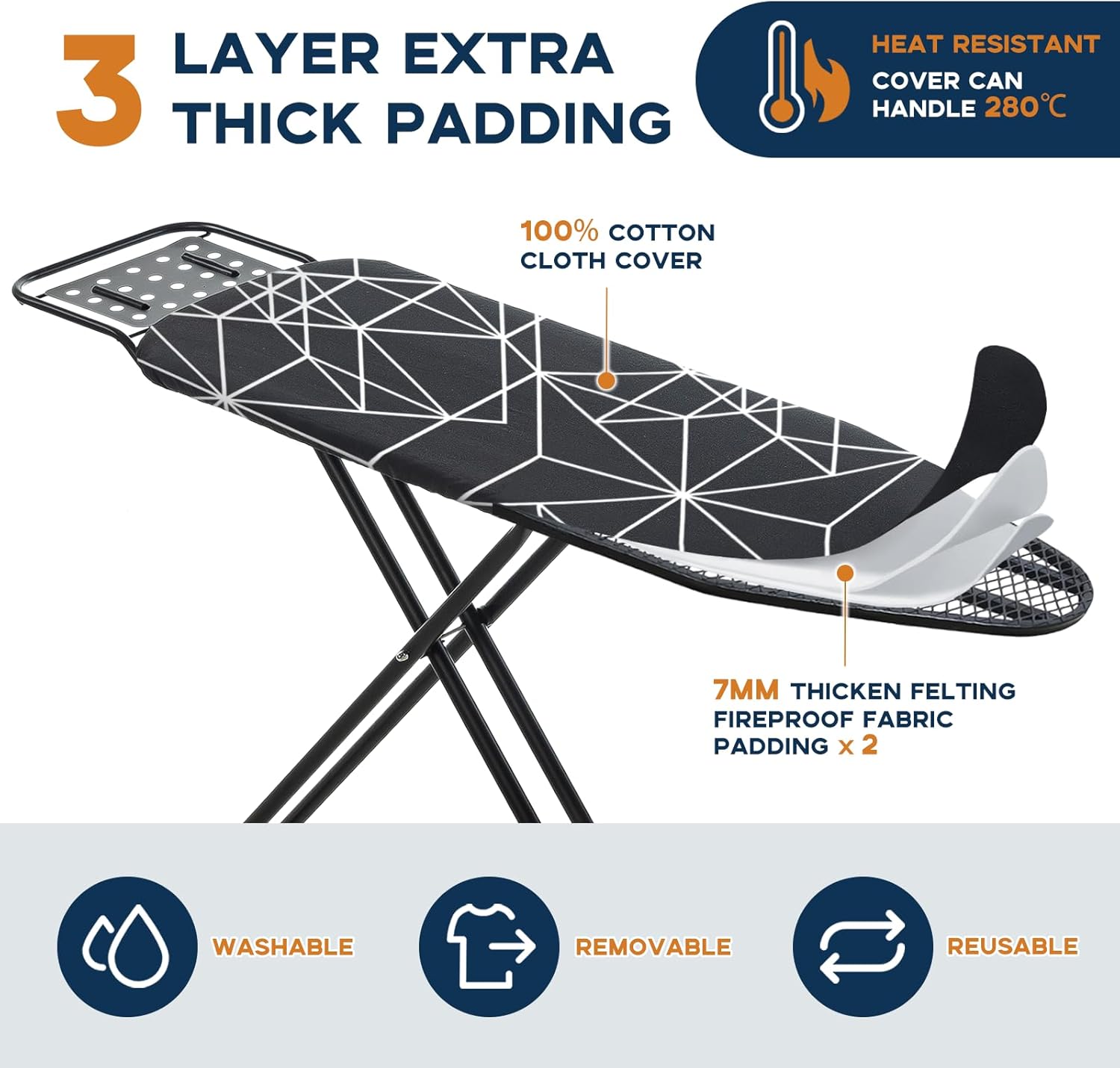 - Heat-resistant Cover: The ironing board cover is a 100% cotton cloth cover. It's removable, washable, and reusable, and it comes with two layers of 7mm thick pads made of fireproof fabric. The extra thick cloth cover ensures you an extraordinary ironing experience.