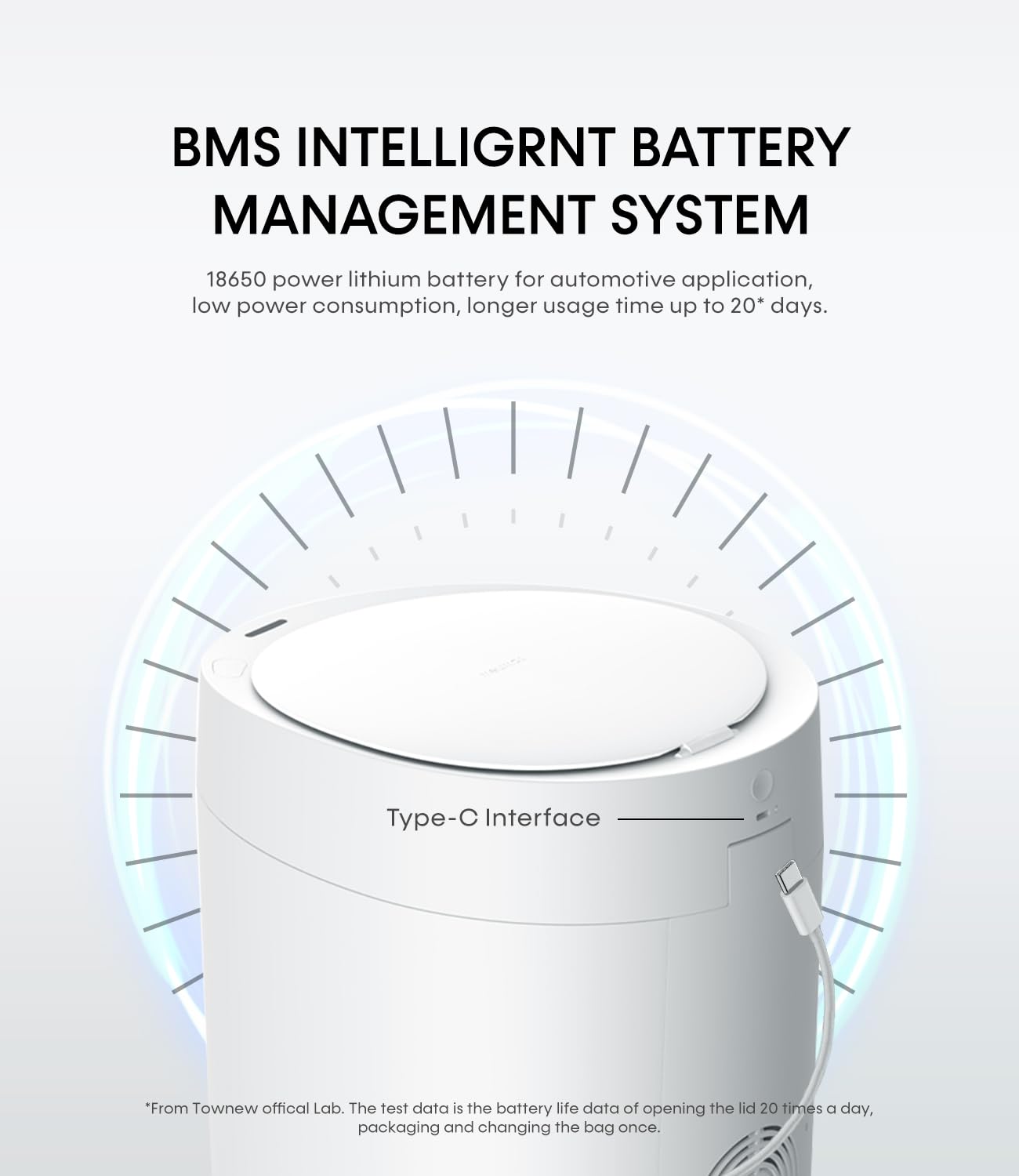 - Touch-free Motion Sensor Lid: The townew garbage can is equipped with latest Infrared Motion Sensor that detects movement and all approaching objects within 35 cm above the sensor panel to open the small lid immediately.